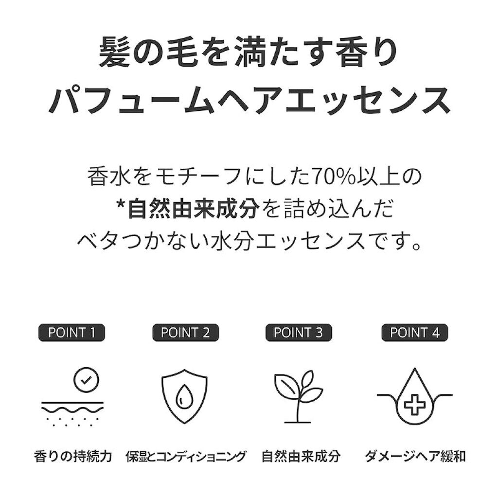- ナイトケアや時間のない朝、お泊り、学校、会社、、など様々なシチュエーションで大活躍なJUL7MEのパフュームヘアエッセンス✨ お出かけ前にふんわりと香りをまとうヘアエッセンス。 ヘアパックに比べ、より軽やかな使用感のローションタイプで伸びが良く、乾いた髪に使用できます。お出かけ前に香水の代わりに髪になじませることで、香りが長時間持続。 ミストタイプのヘアフレグランスに比べ、香りを長時間楽しめます。植物エキスとココナッツオイル配合で髪にうるおいを補給し、ツヤ感、透明感を与えます。