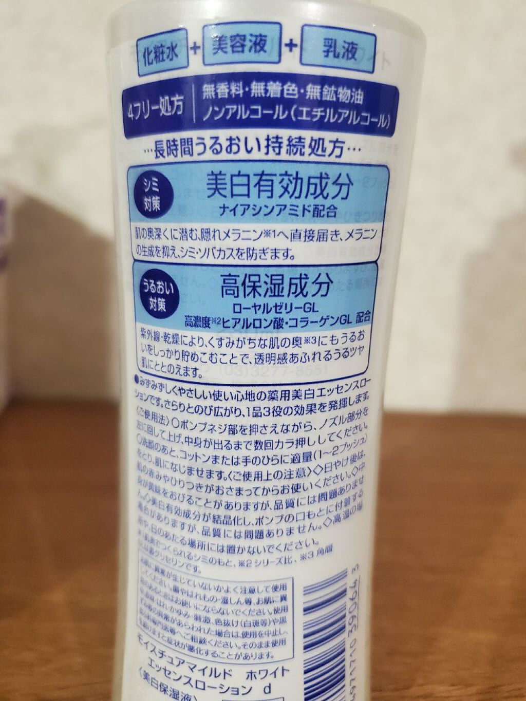 - <230ml> 有効成分 ナイアシンアミド その他の成分 精製水、1,3-ブチレングリコール、濃グリセリン、L-アスコルビン酸2-グルコシド、ヒアルロン酸ナトリウム(2)、リン酸L-アスコルビルマグネシウム、ローヤルゼリーエキス、水溶性コラーゲン液(A)、アクリル酸・メタクリル酸アルキル共重合体、アクリル酸ナトリウム・アクリロイルジメチルタウリン酸ナトリウム共重合体/イソヘキサデカン/ポリソルベート80、エデト酸二ナトリウム、カルボキシビニルポリマー、スクワラン、テトラ2-エチルヘキサン酸ペンタエリトリット、ポリオキシエチレンメチルグルコシド、メチルポリシロキサン、リン酸一水素ナトリウム、リン酸二水素ナトリウム、水酸化ナトリウム、水素添加大豆リン脂質、フェノキシエタノール、メチルパラベン <大容量 400ml> 有効成分 ナイアシンアミド その他の成分 精製水、1,3-ブチレングリコール、濃グリセリン、L-アスコルビン酸2-グルコシド、ヒアルロン酸ナトリウム(2)、リン酸L-アスコルビルマグネシウム、ローヤルゼリーエキス、水溶性コラーゲン液(A)、アクリル酸・メタクリル酸アルキル共重合体、アクリル酸ナトリウム・アクリロイルジメチルタウリン酸ナトリウム共重合体/イソヘキサデカン/ポリソルベート80、エデト酸二ナトリウム、カルボキシビニルポリマー、スクワラン、テトラ2-エチルヘキサン酸ペンタエリトリット、ポリオキシエチレンメチルグルコシド、メチルポリシロキサン、リン酸一水素ナトリウム、リン酸二水素ナトリウム、水酸化ナトリウム、水素添加大豆リン脂質、フェノキシエタノール、メチルパラベン <つめかえ用 200ml> 有効成分 ナイアシンアミド その他の成分 精製水、1,3-ブチレングリコール、濃グリセリン、L-アスコルビン酸2-グルコシド、ヒアルロン酸ナトリウム(2)、リン酸L-アスコルビルマグネシウム、ローヤルゼリーエキス、水溶性コラーゲン液(A)、アクリル酸・メタクリル酸アルキル共重合体、アクリル酸ナトリウム・アクリロイルジメチルタウリン酸ナトリウム共重合体/イソヘキサデカン/ポリソルベート80、エデト酸二ナトリウム、カルボキシビニルポリマー、スクワラン、テトラ2-エチルヘキサン酸ペンタエリトリット、ポリオキシエチレンメチルグルコシド、メチルポリシロキサン、リン酸一水素ナトリウム、リン酸二水素ナトリウム、水酸化ナトリウム、水素添加大豆リン脂質、フェノキシエタノール、メチルパラベン <つめかえ用 360ml> 有効成分 ナイアシンアミド その他の成分 精製水、1,3-ブチレングリコール、濃グリセリン、L-アスコルビン酸2-グルコシド、ヒアルロン酸ナトリウム(2)、リン酸L-アスコルビルマグネシウム、ローヤルゼリーエキス、水溶性コラーゲン液(A)、アクリル酸・メタクリル酸アルキル共重合体、アクリル酸ナトリウム・アクリロイルジメチルタウリン酸ナトリウム共重合体/イソヘキサデカン/ポリソルベート80、エデト酸二ナトリウム、カルボキシビニルポリマー、スクワラン、テトラ2-エチルヘキサン酸ペンタエリトリット、ポリオキシエチレンメチルグルコシド、メチルポリシロキサン、リン酸一水素ナトリウム、リン酸二水素ナトリウム、水酸化ナトリウム、水素添加大豆リン脂質、フェノキシエタノール、メチルパラベン