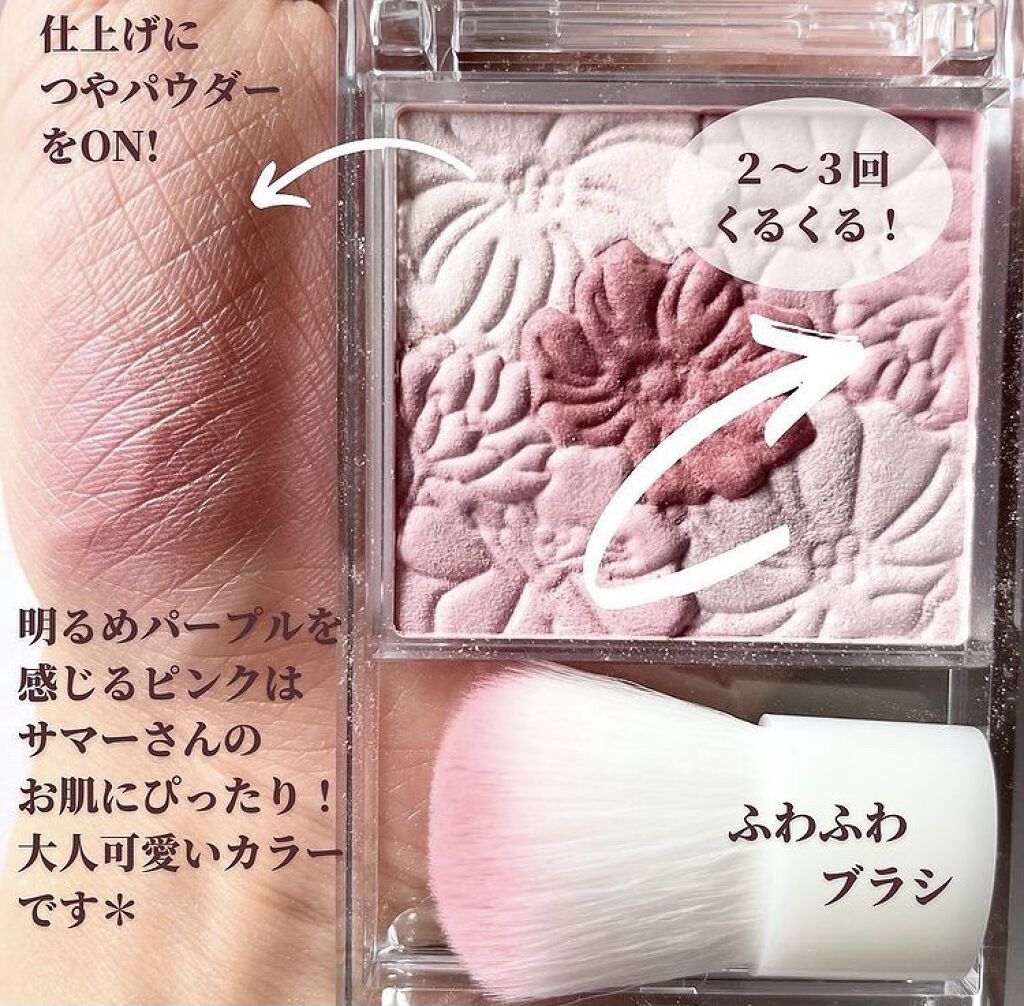 しっとり密着感&透明感!新色のライラックカラー!上品で透明感のある肌に仕上がります。 しっとりとした粉質でお肌に密着し、朝つけたての色が夕方までキープされます。ツヤも発色もバッチリ👌CANMAKEのグロウフルールチークスを1つ持っておくだけで華やかなほっぺになるので便利です! ラメが入っていてツヤ肌になります。パウダーとは思えないほどしっとりとしていて馴染みます。ブラシもふわっふわで肌に優しいです。透明感のある肌にしたい方におすすめです! 華やかな花柄で可愛い!