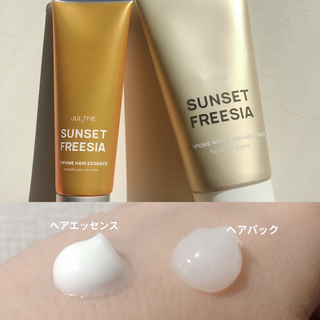 フリージアの香りと甘くみずみずしい梨の香りが作り上げる清楚なフローラルフレグランス 白色の伸びが良いクリームで軽いつけ心地、蓋を開けるとサンセットフリージアがふんわり香ります✨️ 普段は香水の匂いが強くて苦手でつけないから、ケアしながらパフューム効果もある製品は便利🌸