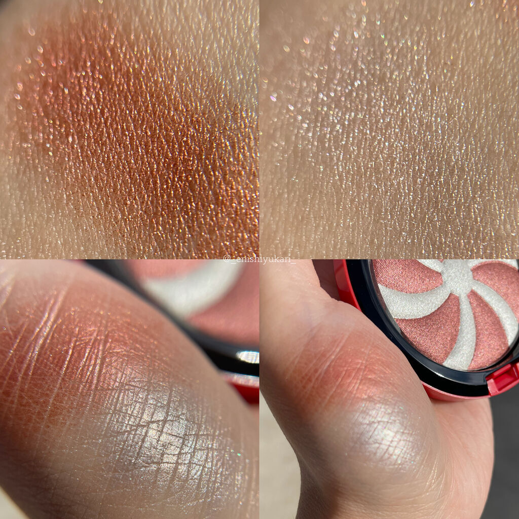 MACのホリデーがかわいすぎる♡ マーブル模様が最高にキュートなハイライトをご紹介〜 MACの粉質はしっとり・高発色・高密着が売り! 見た目通りの美しい艶感とパウダーなのにたいへんなめらかな手触りが魅力ですね このテラッテラ濡れ濡れの艶感が海外ィって雰囲気醸し出してくれて好きです 見た目が最高すぎますね〜キャンディやん?って感じで!めちゃかわいい〜 チークにも使えるキャンディケイン色 ぱっと弾むような血色感が演出できるカラーですね ベツレヘムの星のようなオーナメントゴールド キラッキラのゴージャスな金色が大変お美しいファビュラスな仕上がり…♡ 血色よりも艶感重視なハイライトカラー ホワイト部分も若干ベージュっぽく発色するのでイエベさんでも使いやすいハイライトですね ほっぺたがイキイキときらめくのが最高〜 クリスマスシーズンになるのでわたしがイルミネーションじゃい。という気持ちでたくさん使いたいと思います🎄