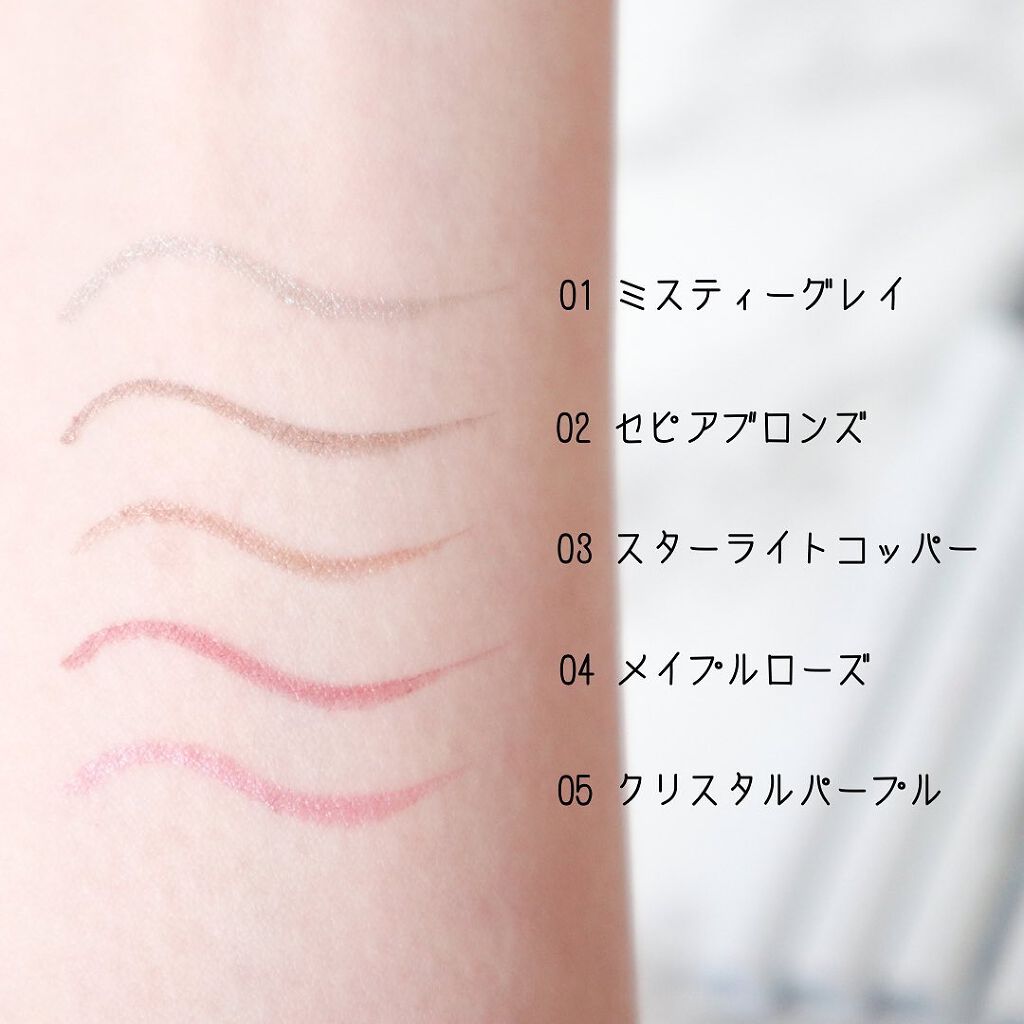色艶感じるパールの質感、上品な輝き、ニュアンスのある色合い、なめらかな使用感、濡れツヤ発色✨ ラメがとても綺麗で感動しました✨ 想像以上に煌めきのある目元に🥹 耐水性ですが、お湯と洗顔で簡単にオフできるのもありがたいです🥰