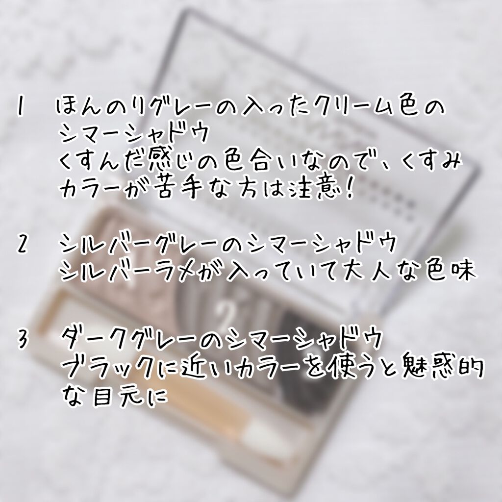 全色シマーシャドウになっていて、まぶたにのせたときのツヤ感がとにかく美しい✨ 色味も絶妙できつくないパープルなので、普段メイクでも問題なさそうです🤔 見た瞬間にほんっっに色味が綺麗すぎてびっくりしたのと、「ブルーベリーレアチーズケーキ」が頭に浮かんできました笑