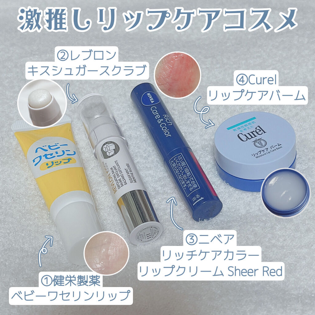 この角質リップバームを初めて使った時はめちゃくちゃ唇がツルツルするし、しっとりするしで感動した商品! リピ4本目くらい?かな。 朝のメイク前に先に塗っといて、リップ下地代わりにも使ってるから私は無色のこれを愛用してます。 唇が乾燥してカサカサ皮がめくれたりしてたけど、私はこれが一番唇の状態が落ち着くので、多分買い続けます。