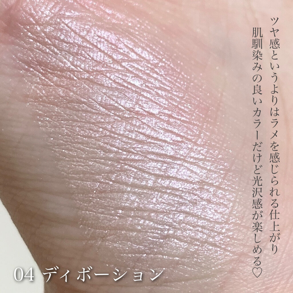 - <01 インディスクレション> マイカ、エチルヘキサン酸ステアリル、(HDI/トリメチロールヘキシルラクトン)クロスポリマー、グリセリン、スクワラン、ステアロイルオキシステアリン酸オクチルドデシル、ポリソルベート20、カプリリルグリコール、エチルヘキシルグリセリン、1、2‐ヘキサンジオール、カラギーナン、キサンタンガム、テトラ(ジ‐t‐ブチルヒドロキシヒドロケイヒ酸)ペンタエリスリチル、シリカ、リン酸2Ca、合成フルオロフロゴパイト、酸化チタン、酸化鉄 <02 セダクション> マイカ、エチルヘキサン酸ステアリル、(HDI/トリメチロールヘキシルラクトン)クロスポリマー、グリセリン、スクワラン、ステアロイルオキシステアリン酸オクチルドデシル、ポリソルベート20、カプリリルグリコール、エチルヘキシルグリセリン、1、2‐ヘキサンジオール、カラギーナン、キサンタンガム、テトラ(ジ‐t‐ブチルヒドロキシヒドロケイヒ酸)ペンタエリスリチル、シリカ、リン酸2Ca、合成フルオロフロゴパイト、酸化チタン、酸化鉄 <04 ディボーション> マイカ、エチルヘキサン酸ステアリル、(HDI/トリメチロールヘキシルラクトン)クロスポリマー、スクワラン、ステアロイルオキシステアリン酸オクチルドデシル、グリセリン、ポリソルベート20、カプリリルグリコール、エチルヘキシルグリセリン、1、2‐ヘキサンジオール、テトラ(ジ‐t‐ブチルヒドロキシヒドロケイヒ酸)ペンタエリスリチル、カラギーナン、キサンタンガム、シリカ、リン酸2Ca、合成フルオロフロゴパイト、(+/-)、酸化チタン、酸化鉄、酸化スズ