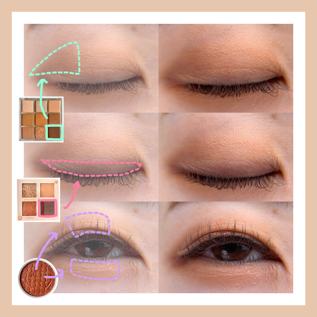 EGLIPSのリトルサンシャインはオレンジパレット界の王さまだと思っています👑 エクセルのピーチメルバは細かいラメがぎっしりで薄づきなので、ベースのすぐ後に全体に塗ってあげると一気に目がオレンジを受け入れられます🧡 最後にのせたBR416はゴールドとレッドのパールがすごく綺麗なので、ピーチメルバとの相性が抜群!