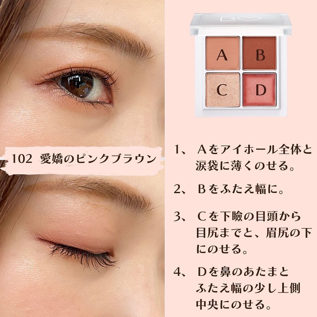 愛嬌のピンクブラウンも釘付けのブラウンレッドも 愛嬌のピンクブラウンは ブラウン味が強く、その中にほんのりピンクを纏う 仕上がりで柔らかい優しい印象になります✾ 釘付けのブラウンレッドは 右上の ラメが入ったブラウン味のあるレッドがキレイに発色し、目尻にくの字に入れると熱を帯びたような、 色っぽさも感じるような、うるっとした目元に仕上がり ます♡