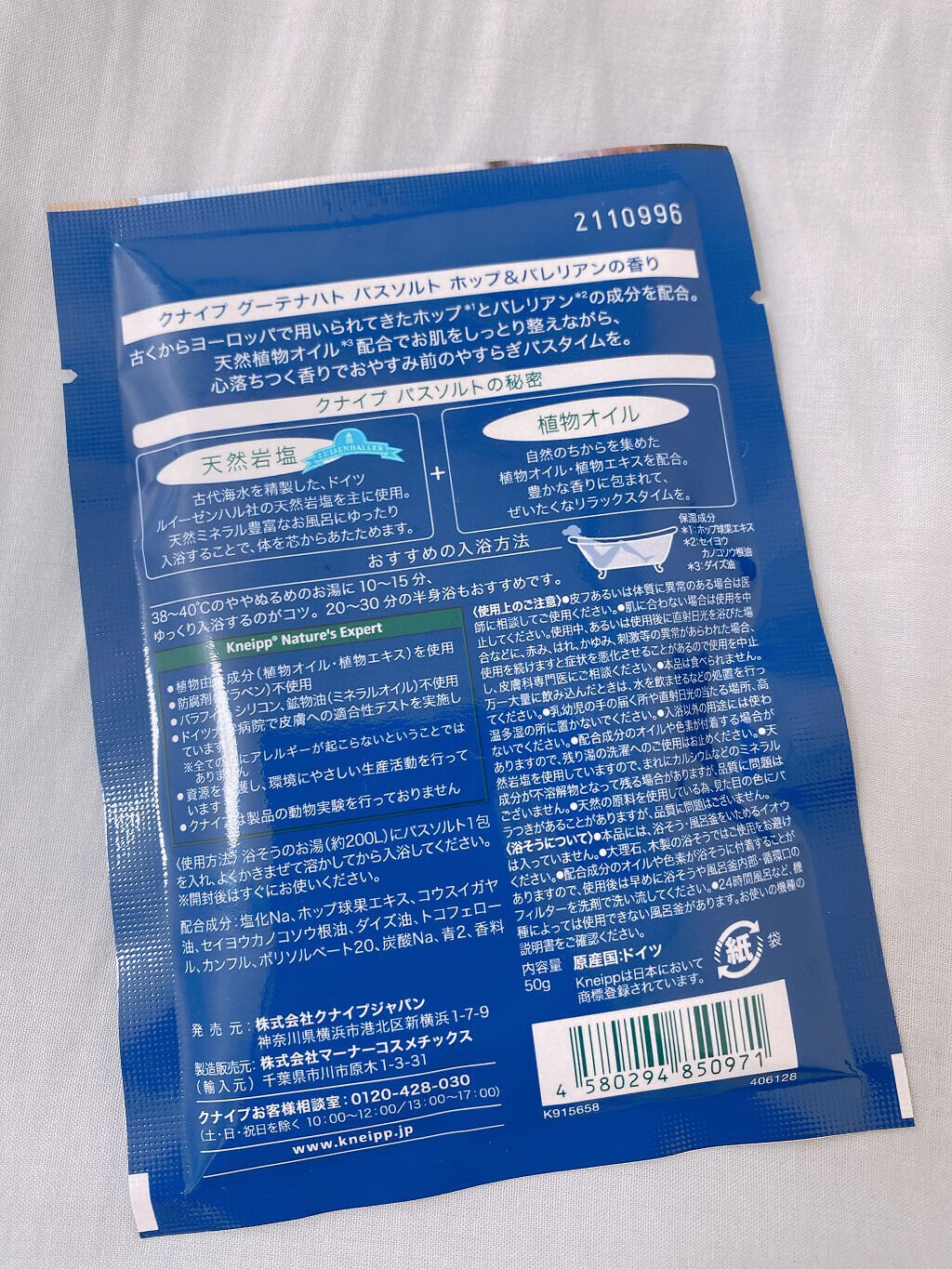 グーテナハトバスソルトホップ&バレリアンの香り・睡眠の質が上がると聞き気になっていたときにlipsで見つけ購入。・浴槽に入れる前は香りが強すぎて不安になったが、入れて混ざるといい香りで癒された。・お湯の色が結構な青さになって驚いた。着色料はい...