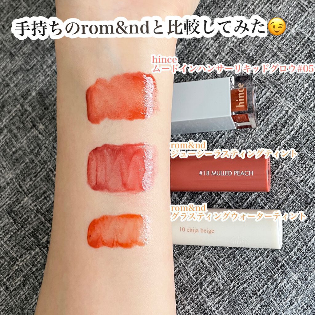 激推しカラーは06イン・デップスと、07アリュ_リング💓 くすみ色なのに暗くなりすぎず、しっかり発色するのに重たい印象にならない、ヒンスならではの絶妙なカラーです。 量が多すぎると変に乾いてしまって、唇を擦り合わせた時に塊がポロポロ落ちることがあるので塗りすぎ注意です。少しの量でもしっかり発色してぷっくりします✨