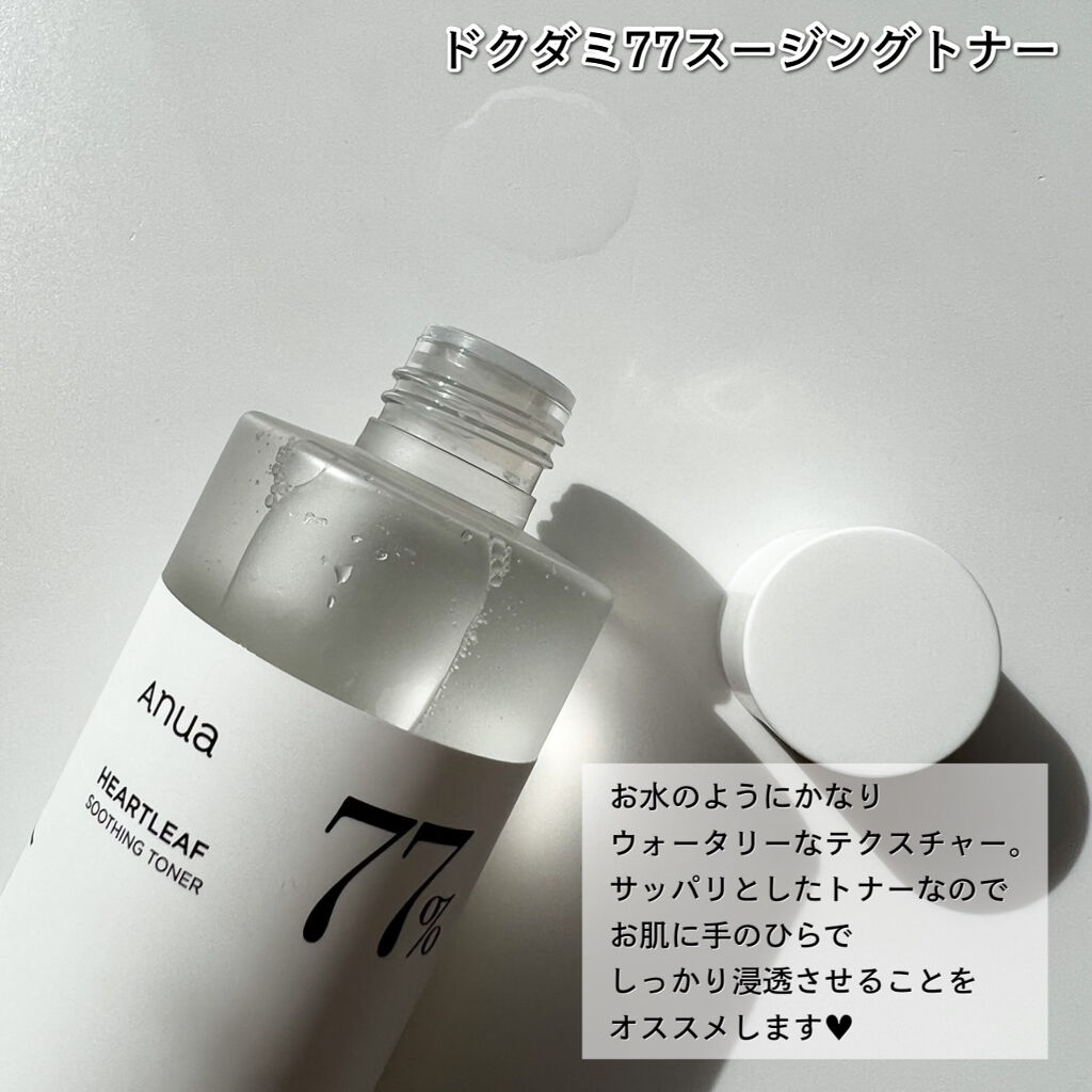 液体の77%がドクダミエキス※! ※整肌成分 軽くてとろみのあるテクスチャーで肌馴染みが良い使い心地です。 ダメージを受けた肌にも朝晩使えて人気の理由がわかるトナーでした♡