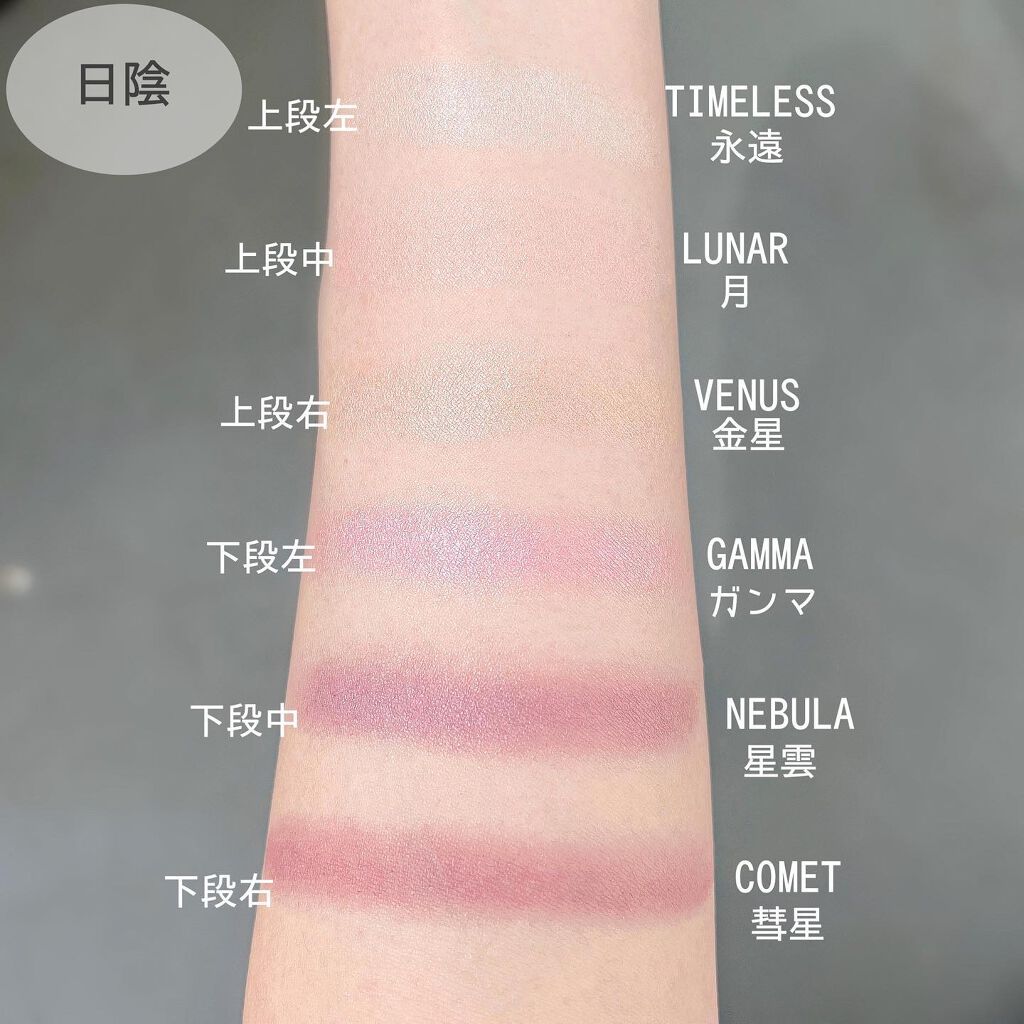 全体的な仕上がりは大人っぽくシックな雰囲気。 ちょっと儚げでスモーキーな感じもあるかな。 おとなしめと見せかけて右上のカラーに青ラメが入っていてさりげなく主張してくるのがすごく可愛い。 個人的には左上のハイライトとしても使えるベースカラーのほんのりピンクみを帯びているところが好き。 いかにもなハイライトじゃなくてほんとに肌に馴染むからナチュラルに使えるしアイメイクのベースに仕込んでおくと目元に明るさが出るし持ちも良くなるしメイクを底上げしてくれる感じがする◎ プチプラとは思えないしっとり質感と密着力の高さにも感動。 グレージュピンクがとても良かったのでチェリーオレンジも気になる、、、🍒🍊