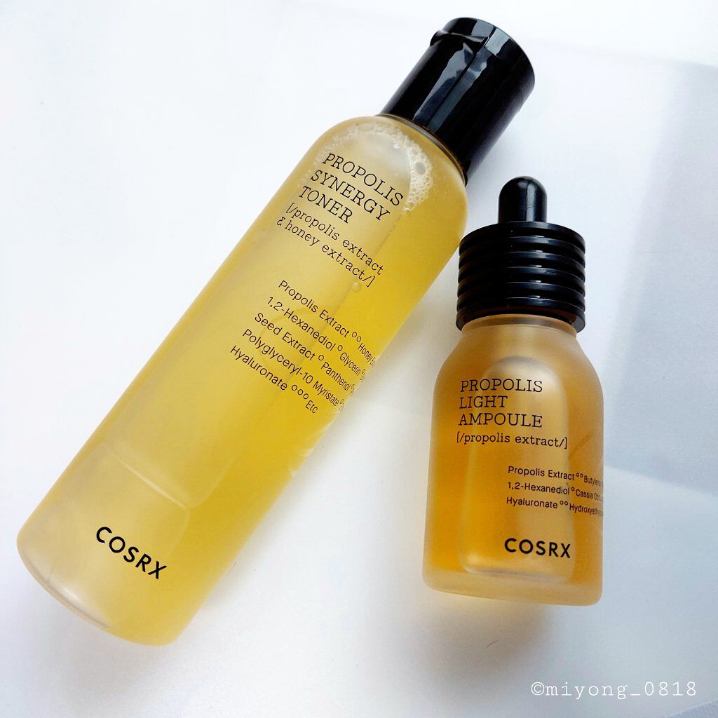 プロポリスエキスがトナー・・72.6% アンプル・・83%だそうです。 香りはほぼないです。めっちゃ使いやすい。 トナーはどっちかというとシャバシャバ系のテクスチャー。 特に化粧水はストック買いしたいと思うほどに気に入った💞