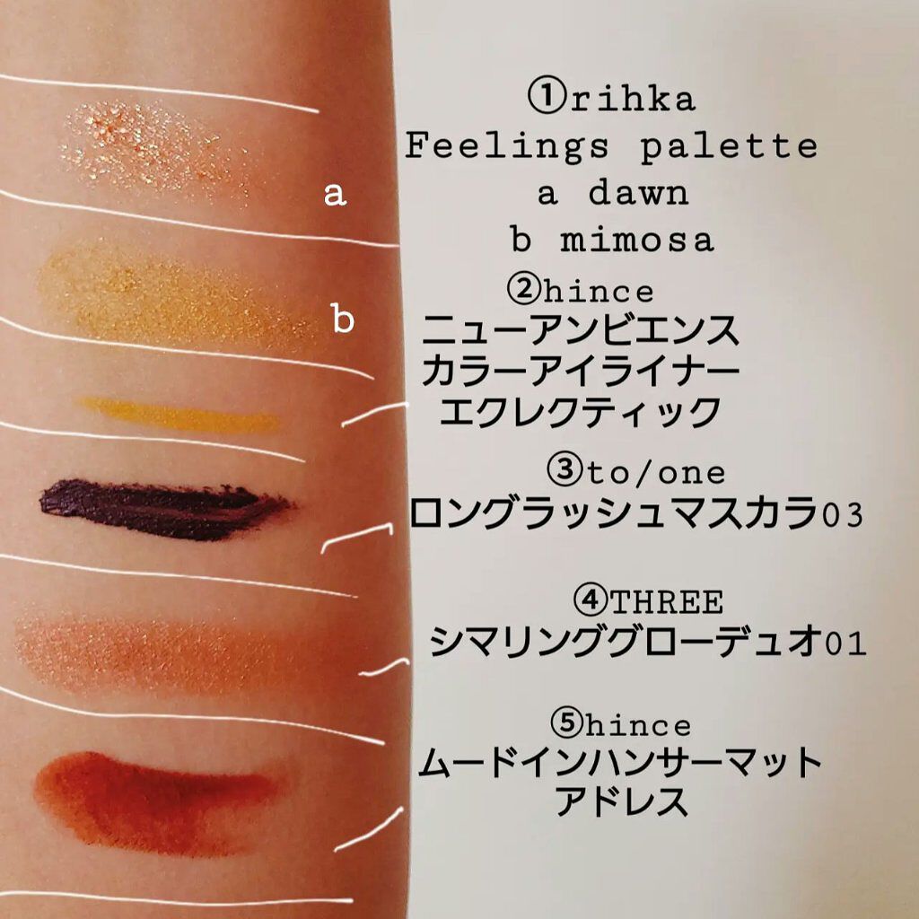 アイブロウは#whomeeのレッドブラウンを使用。 アイメイクは①#アンドビーの#クリームアイシャドウ マスタードを上下の瞼に。 アイメイクは②#misshaの#グリッタープリズムシャドウマーブル #ストームプリズムを①に重ねて。 下瞼は全体ではなく、黒目下にだけ✨ アイメイクは③#hinceの#ニューアンビエンスカラーアイライナー #エクレクティックを4枚目のように三角形に入れる。 チークは⑤#bisouの#ダイヤモンドグロウ マーズをほんのり✨ リップは⑥①のマスタードを塗った後に#celvokeの#エンスロールマットリップス 03を💋