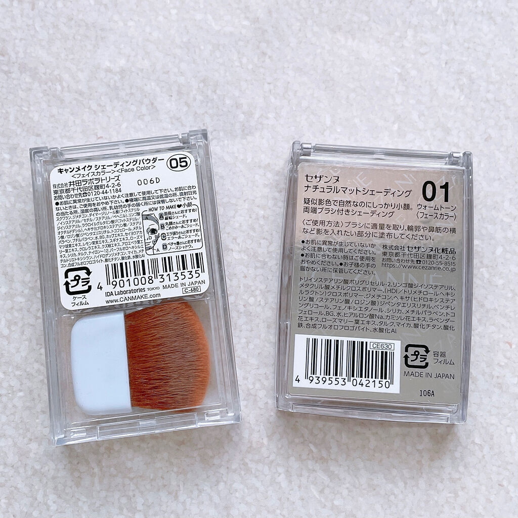 キャンメイクの方がグレー感があります。黄味よりも赤味があるような感覚です。 セザンヌは赤味よりも黄味が出る感覚。私はセザンヌのほうが自然に仕上がりました♡ どちらもマットですが、なんとなくキャンメイクのほうが、マット感が強いと感じました。 セザンヌのほうがより自然に肌に合う感じ、馴染む感じがします。 キャンメイクのほうが柔らかく、ふわっとした粉が舞うような感覚です。 セザンヌも柔らかい粉質ですが、キャンメイクと比べると若干しっとり感があると思います♡ 付属のブラシは圧倒的セザンヌが使いやすいです。なんといっても両端に2パターン付いているので、部位によって使い分けができます! キャンメイクは748円セザンヌは693円 どちらもプチプラで、手の出しやすい価格です☆