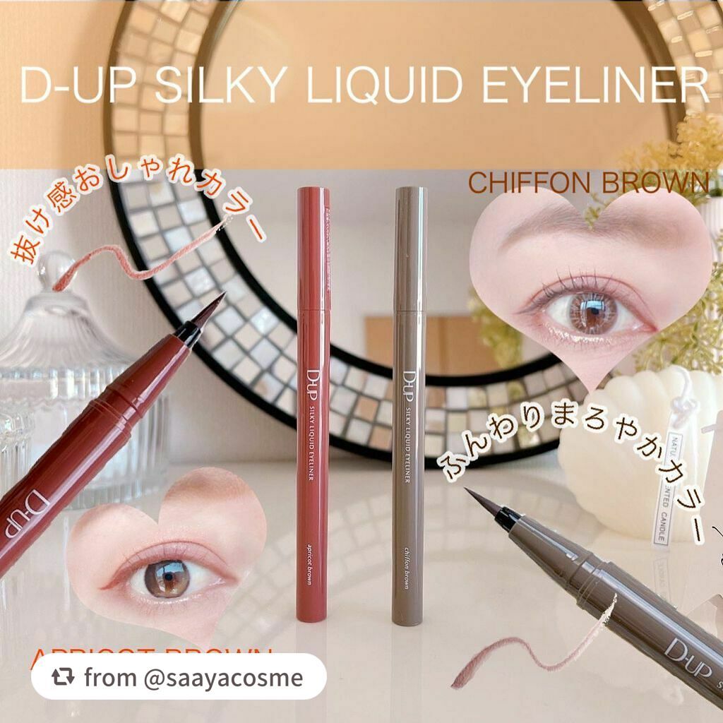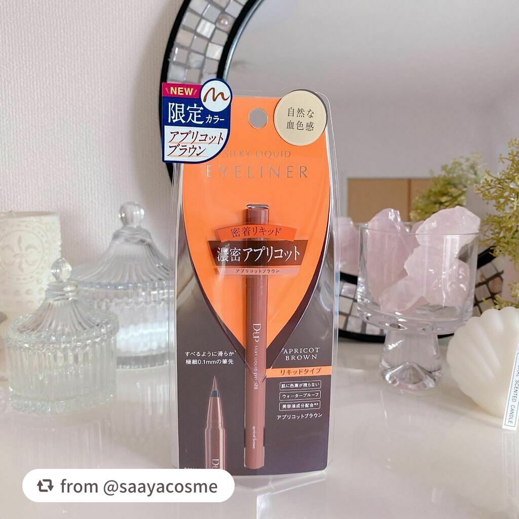 - 筆先までずっとなめらか、目尻で感動するリキッドアイライナー。 必要な量が肌にのる新設計で、まぶたの上をすべるような、滑らかな描き心地。しなやかでコシのある筆が、筆圧のコントロールを容易にし、太いラインも細いラインも思い通りに仕上げます。水、汗、涙に強いウォータープルーフタイプなのに、通常洗顔で簡単オフ。肌に色素が残らない顔料を使用。5種類の美容液成分を従来品の200%配合し、メイクしながら目元ケアまで。 ●ブラウンブラック ※2020年9月12日 バラエティショップ先行発売 ●漆黒ブラック ※2020年12月頃発売予定 ●ナチュラルブラウン ※2020年12月頃発売予定 ●シフォンブラウン 「毎日メイクに透明感と抜け感」 ブラウンでも、グレーでも、ベージュでもないニュアンスカラー。 自然な印影で素の目元を際立て、頑張りすぎない、ふんわりとした目元に。 ●アプリコットブラウン 「じゅわっと血色感。 肌に馴染むおしゃれカラー」 温かみのあるアプリコットがじゅわっと滲む血色感を目元に演出。 肌馴染みが良いので、カラーライナーに抵抗がある方もブラウンの延長線上で楽しめる、使いやすい色味です。 ”ちょっとオシャレ”な空気感を演出するカラー。 ●ピンクショコラ アイライナー 「ピンクが溶け込む濃厚ブラウン」 肌馴染みが良く、目元にじんわり血色感をプラス。 さりげなく女性らしさが加速するようなカラー。 ●ピスタチオラテ (2022年7月29日(金)発売) 「“目尻”に抜け感アクセント」 肌に馴染むのに映える絶妙なグリーン。 トレンドカラーに“くすみ”と“抜け感”をプラスしたまろやかな発色。 ●マスタードブラウン 「“イエロー”が揺れる、大人の洒落色」 (2022年7月29日(金)発売) まるで太陽のような暖かさを感じる新しいブラウン。 ほんのり感じるイエローでメイクが一気に垢抜ける稀有な色。 ●シフォンピンク(2023年2月10日発売) 「ふんわり柔らか"まろみピンク"」 甘くなりすぎない青みニュアンスで目元の透明感UP。 目元を引き締め、ピンクメイクにありがちな腫れぼったさを解消。 ●ミルクカプチーノ(2023年4月21日発売) まろやかな深みの“優しい締め色” どんなメイクにも合わせやすいカラー。 自然な陰影でさりげなく目幅を拡張します。 ●グレーカシミア(2023年10月1日発売) ブラウンがほんのり溶け込んだ、暖色グレー まろやかな発色で、パーソナルカラーを問わず肌に馴染む 目元の陰影になりすまし、抜け感と目力を欲張りに叶える ●ダークフィグ(2024年6月1日発売) するする”なめらか。描きやすいのに、落ちにくい。 クッキリ可愛いほの甘ダークブラウン ●ピーチモカ(2024年8月1日発売) ふわっと自然に盛れる“桃色ブラウン” ほんのり血色感で目元にうるみ感を演出 ●スターダストブラウン(2024年12月11日発売) キラッと繊細に輝く''星屑ブラウン'' 透け感のあるダークブラウンの色味とラメの輝きが、目元に艶のある立体感を演出 ●チャコールモカ(2025年4月10日発売) 目元を締める''深みグレージュ'' 黄みや赤みに偏りすぎない絶妙な色設計で、自然に目元を強調