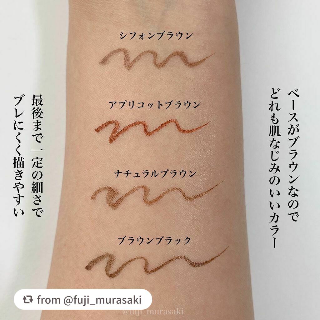 - 筆先までずっとなめらか、目尻で感動するリキッドアイライナー。 必要な量が肌にのる新設計で、まぶたの上をすべるような、滑らかな描き心地。しなやかでコシのある筆が、筆圧のコントロールを容易にし、太いラインも細いラインも思い通りに仕上げます。水、汗、涙に強いウォータープルーフタイプなのに、通常洗顔で簡単オフ。肌に色素が残らない顔料を使用。5種類の美容液成分を従来品の200%配合し、メイクしながら目元ケアまで。 ●ブラウンブラック ※2020年9月12日 バラエティショップ先行発売 ●漆黒ブラック ※2020年12月頃発売予定 ●ナチュラルブラウン ※2020年12月頃発売予定 ●シフォンブラウン 「毎日メイクに透明感と抜け感」 ブラウンでも、グレーでも、ベージュでもないニュアンスカラー。 自然な印影で素の目元を際立て、頑張りすぎない、ふんわりとした目元に。 ●アプリコットブラウン 「じゅわっと血色感。 肌に馴染むおしゃれカラー」 温かみのあるアプリコットがじゅわっと滲む血色感を目元に演出。 肌馴染みが良いので、カラーライナーに抵抗がある方もブラウンの延長線上で楽しめる、使いやすい色味です。 ”ちょっとオシャレ”な空気感を演出するカラー。 ●ピンクショコラ アイライナー 「ピンクが溶け込む濃厚ブラウン」 肌馴染みが良く、目元にじんわり血色感をプラス。 さりげなく女性らしさが加速するようなカラー。 ●ピスタチオラテ (2022年7月29日(金)発売) 「“目尻”に抜け感アクセント」 肌に馴染むのに映える絶妙なグリーン。 トレンドカラーに“くすみ”と“抜け感”をプラスしたまろやかな発色。 ●マスタードブラウン 「“イエロー”が揺れる、大人の洒落色」 (2022年7月29日(金)発売) まるで太陽のような暖かさを感じる新しいブラウン。 ほんのり感じるイエローでメイクが一気に垢抜ける稀有な色。 ●シフォンピンク(2023年2月10日発売) 「ふんわり柔らか"まろみピンク"」 甘くなりすぎない青みニュアンスで目元の透明感UP。 目元を引き締め、ピンクメイクにありがちな腫れぼったさを解消。 ●ミルクカプチーノ(2023年4月21日発売) まろやかな深みの“優しい締め色” どんなメイクにも合わせやすいカラー。 自然な陰影でさりげなく目幅を拡張します。 ●グレーカシミア(2023年10月1日発売) ブラウンがほんのり溶け込んだ、暖色グレー まろやかな発色で、パーソナルカラーを問わず肌に馴染む 目元の陰影になりすまし、抜け感と目力を欲張りに叶える ●ダークフィグ(2024年6月1日発売) するする”なめらか。描きやすいのに、落ちにくい。 クッキリ可愛いほの甘ダークブラウン ●ピーチモカ(2024年8月1日発売) ふわっと自然に盛れる“桃色ブラウン” ほんのり血色感で目元にうるみ感を演出 ●スターダストブラウン(2024年12月11日発売) キラッと繊細に輝く''星屑ブラウン'' 透け感のあるダークブラウンの色味とラメの輝きが、目元に艶のある立体感を演出 ●チャコールモカ(2025年4月10日発売) 目元を締める''深みグレージュ'' 黄みや赤みに偏りすぎない絶妙な色設計で、自然に目元を強調