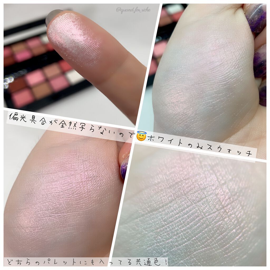 もう可愛い!!!!!!! 以外の語彙力失うくらい可愛い💕 パケの色違い具合からとにかく可愛い🥺💜 ホワイト(P)のみ どちらのパレットにも入ってて これがゴールド~ピンク、赤って偏光して ペカーーーー🌟って発光する パール感がめっちゃ可愛いんだけど!! ラメカラーが可愛いのは もう見たままなんだけど、 下段のローズカラーめっちゃ好き! 大人っぽいカラーに 可愛いラメやパール、 ふんわりマットカラーで 女の子らしさを足したようなパレット💜✨ 買うか買わないかひたすら悩んだけど… 心の底から買ってよかった😭💗💗 どちらかと言えばイエベさん向きだけど 全体的にふんわりな色づきと めっちゃ黄みが強く出ることはないから 肌なじみめっちゃいい👏🏻💗💗 あーーーー、ホリデーのコフレって 楽しいねー🤤🎄🎁🌟