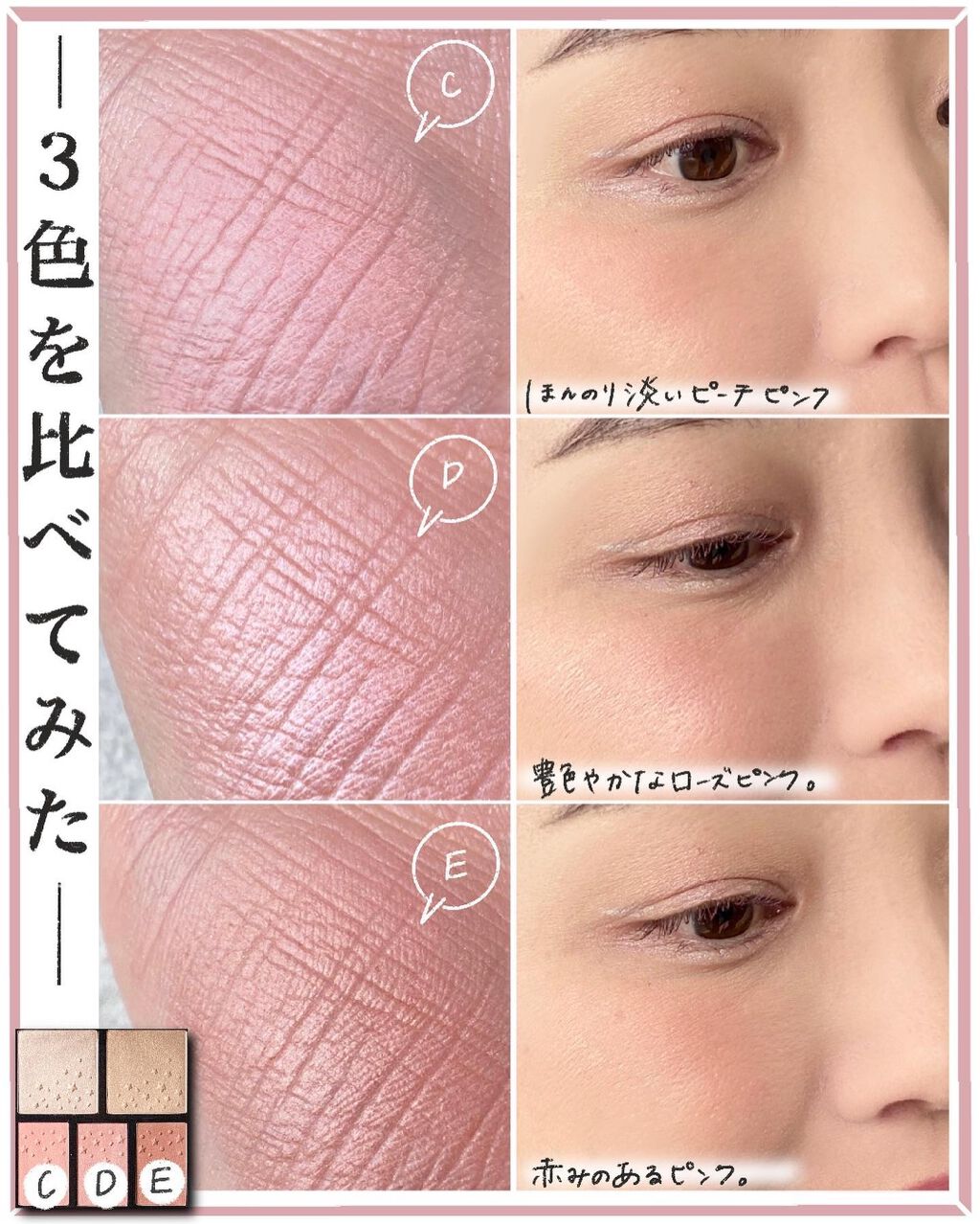 2023年にどどんとリニューアル!全30色展開で新たに発売をスタートしました。 多色パールがこれでもか!ってくらいたっぷり煌めくピンクベージュはほんの少しオレンジのニュアンスも感じられるヘルシーなカラー。 こういうピンクベージュ系の単色シャドウって、ほんとにメイクのベース的に使いやすくて重宝するのよね😚