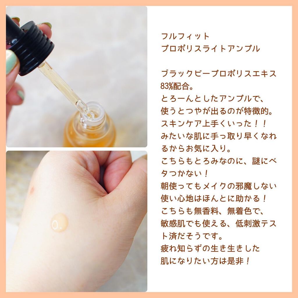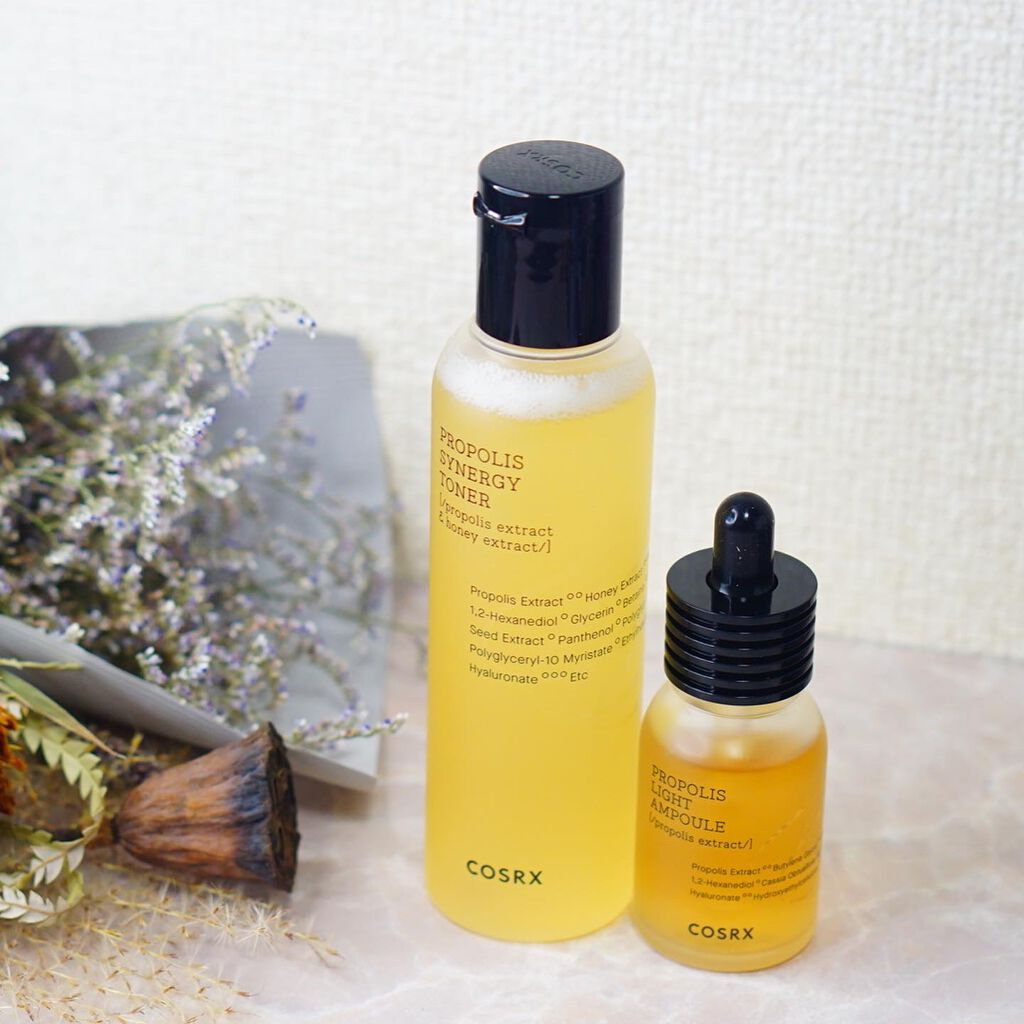 プロポリスエキスがトナー・・72.6% アンプル・・83%だそうです。 香りはほぼないです。めっちゃ使いやすい。 トナーはどっちかというとシャバシャバ系のテクスチャー。 特に化粧水はストック買いしたいと思うほどに気に入った💞