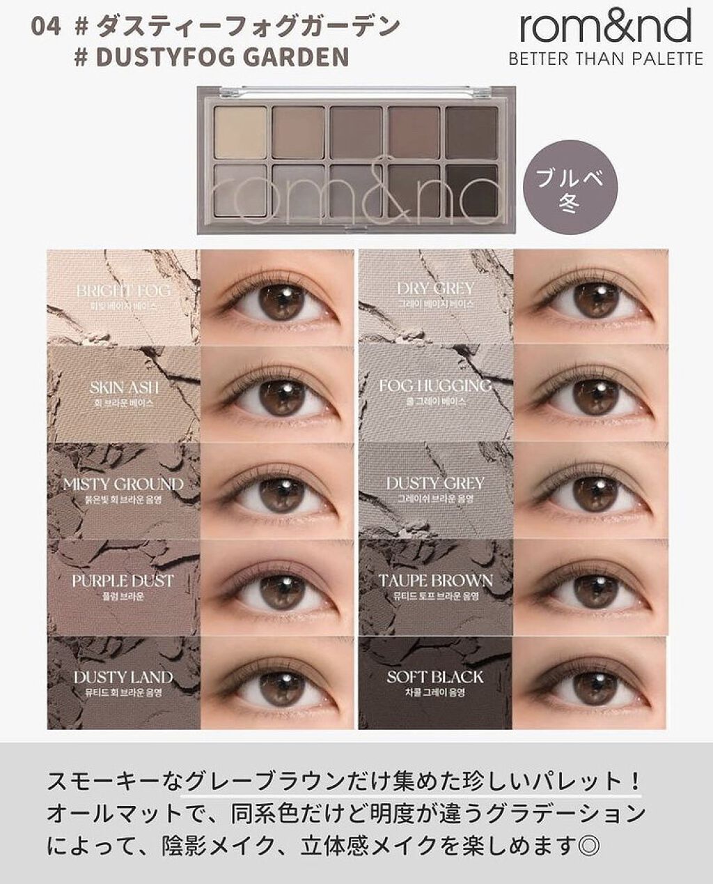 ロムアンドってどうしてこんなに可愛いいんでしょう。 マットの質感はどれもキメ細やかでムラになりにくい◎ そしてラメ&グリッターも柔らかく密着力がすごい、様々な色が揃っているのでグラデーションも作りやすいのもいい所♡ コーラルピンクとゴールドラメが中心の華やかで春らしいパレット。 ブラウンベージュとゴールドラメ中心の使いやすくて温かみのあるパレット くすみ感のあるローズピンクパレット スモーキーなグレーブラウンだけ集めた珍しいオールマットパレット