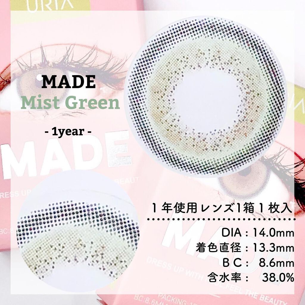 発色抜群で強めのグリーンカラコン💚💚 薄めの黒フチにエメラルドグリーンのような宝石みたいなグリーンカラーが広がります💎 発色はかなり強めだから少しコスプレ用カラコン感が出ちゃうかも🤔 ナチュラルメイクよりはギャルメイクに合うと思う! ちょっと普段と違ったカラコンをつけたいときにおすすめ🫶🏾💚💚 ぜひチャレンジしてみて!!
