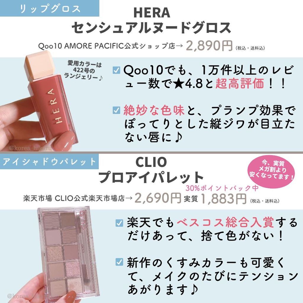マットな仕上がりやツヤ肌の仕上がり、カバー力の高さや保湿力など・・・ ご自身の肌悩みや使用シーン、重要ポイントに合わせて、選んでみてくださいね✨ 私は、ラネージュ、HERA、CLIOのオールニューをシーンによって使い分けていますよ💪 日中パソコンやスマホをよく使うので、「ブルーライトカット」機能があるラネージュをメイン使いにして、持ち運んだり、お直しにはHERAを使って、隠したい肌トラブル多い日にはカバー力の高いCLIOを使っています💓 今、楽天CLIOが30%ポイント還元で実質価格がメガ割級に安くなってるので、気になっている方は、ぜひお得にゲットしてくださいね〜🙌😆 私はキルカバーの新作水光肌ファンデをポチりました!!💎