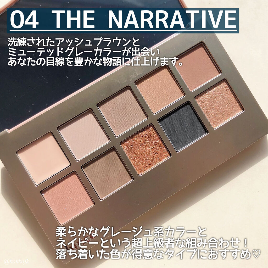 - 多彩なテクスチャーと軽快なカラーがあなたの観点と姿勢を自由にします。 -ひとつのアイシャドウパレットで体験できる8つ以上の多彩なテクスチャー。 -軽快なポイントカラーと陰影カラーを組み合わせた感覚的な10種類のアイシェード。 -肌に染み込むように塗られ、長時間キープされる高密着のカラーピグメント。 -面と線を繋ぐヒンスのデザインのモチーフが優雅な雰囲気を醸し出すシグネチャーパッケージ。