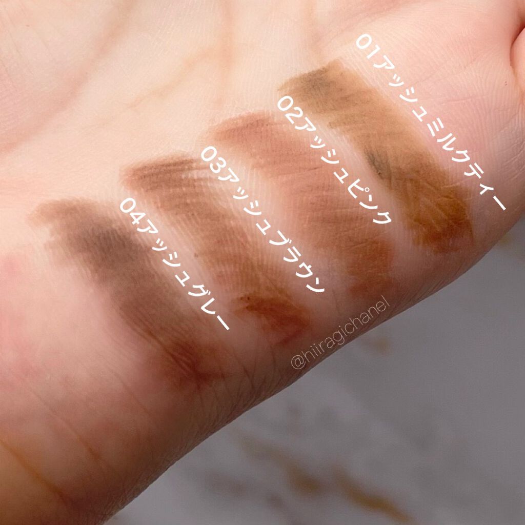 - <01 アッシュミルクティー> ベヘン酸、モクロウ、トリエチルヘキサノイン、ダイマージリノール酸(フィトステリル/イソステアリル/セチル/ステアリル/ベヘニル)、トリ酢酸テトラステアリン酸スクロース、水添ヒマシ油、セスキイソステアリン酸ソルビタン、スクワラン、ラウロイルリシン、水酸化Al、トコフェロール、シリカ、セルロース、マイカ、酸化鉄、酸化チタン <02 アッシュピンク> ベヘン酸、モクロウ、トリエチルヘキサノイン、ダイマージリノール酸(フィトステリル/イソステアリル/セチル/ステアリル/ベヘニル)、トリ酢酸テトラステアリン酸スクロース、水添ヒマシ油、セスキイソステアリン酸ソルビタン、スクワラン、ラウロイルリシン、水酸化Al、トコフェロール、シリカ、セルロース、マイカ、酸化鉄、酸化チタン <03 アッシュブラウン> ベヘン酸、モクロウ、トリエチルヘキサノイン、ダイマージリノール酸(フィトステリル/イソステアリル/セチル/ステアリル/ベヘニル)、トリ酢酸テトラステアリン酸スクロース、水添ヒマシ油、セスキイソステアリン酸ソルビタン、スクワラン、ラウロイルリシン、水酸化Al、トコフェロール、シリカ、セルロース、マイカ、酸化鉄、酸化チタン <04 アッシュグレー> ベヘン酸、モクロウ、トリエチルヘキサノイン、ダイマージリノール酸(フィトステリル/イソステアリル/セチル/ステアリル/ベヘニル)、トリ酢酸テトラステアリン酸スクロース、水添ヒマシ油、セスキイソステアリン酸ソルビタン、スクワラン、ラウロイルリシン、水酸化Al、トコフェロール、シリカ、セルロース、マイカ、酸化鉄、酸化チタン <05 アッシュオリーブ> ベヘン酸、モクロウ、トリエチルヘキサノイン、ダイマージリノール酸(フィトステリル/イソステアリル/セチル/ステアリル/ベヘニル)、トリ酢酸テトラステアリン酸スクロース、水添ヒマシ油、セスキイソステアリン酸ソルビタン、スクワラン、ラウロイルリシン、水酸化Al、トコフェロール、シリカ、セルロース、マイカ、酸化鉄、酸化チタン