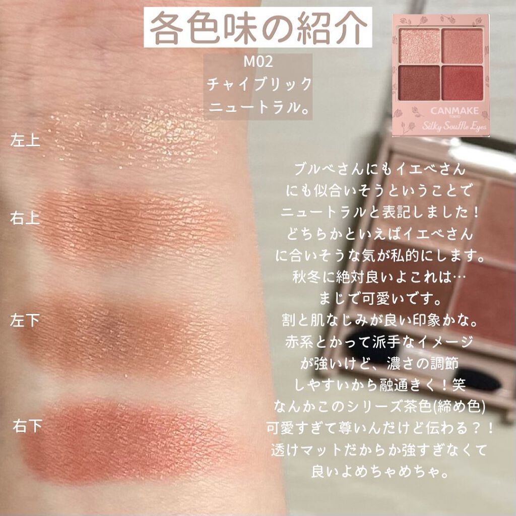 シルキースフレアイズ 通常タイプとマットタイプがあって どっちも大人可愛い透けパレット♡ しっとりとした質感だし これで1,000円以下はすごい… 04 サンセットデート オレンジがかったお洒落レッド ※今夏廃盤 🎨イエベ春、イエベ秋 10色もあるから・ピンク系・オレンジ系で 似た色比較も✨詳しくは画像を見てね!