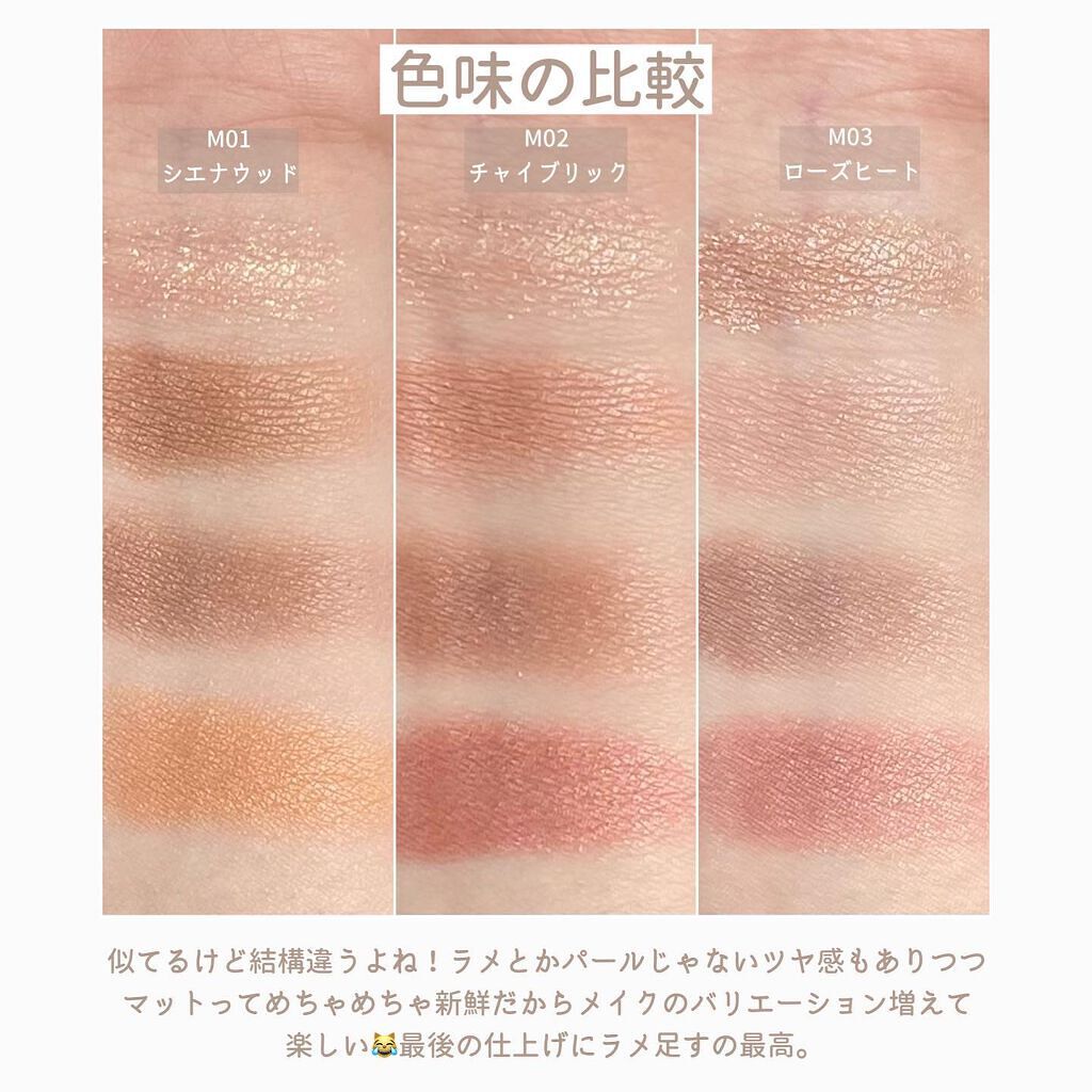 とにかく可愛いし、値段もそこまで高くなくて、ネット限定色以外はLOFTなどの店舗で簡単に購入出来てしまうので良かったら最後まで見ていってください💁🏻♀️ 特にEM10の色味とか絶妙すぎて好きな方多いはず🥺 流行りの粘膜色にくすみが足されてる感じが究極にお洒落すぎる。 マットな質感だから塗ってポンポンと伸ばしていくうちに、パウダリーに変化していきます! ただ1度につく量がかなり多いのでリップに使う際は1度塗ってからティッシュオフをする事で表面上の色味が取れにくくなり、マスクをしてもかなり耐久してくれます😷 私は好きだったんだけど結構甘めなチョコレートっぽい香りがします。 特にマスクで密閉されちゃうから匂いがこもりやすいのもあって、気になる方はずっと気になっちゃうかもしれない😭