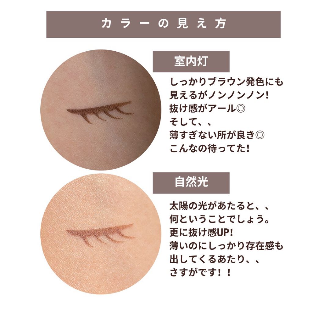 - 筆先までずっとなめらか、目尻で感動するリキッドアイライナー。 必要な量が肌にのる新設計で、まぶたの上をすべるような、滑らかな描き心地。しなやかでコシのある筆が、筆圧のコントロールを容易にし、太いラインも細いラインも思い通りに仕上げます。水、汗、涙に強いウォータープルーフタイプなのに、通常洗顔で簡単オフ。肌に色素が残らない顔料を使用。5種類の美容液成分を従来品の200%配合し、メイクしながら目元ケアまで。 ●ブラウンブラック ※2020年9月12日 バラエティショップ先行発売 ●漆黒ブラック ※2020年12月頃発売予定 ●ナチュラルブラウン ※2020年12月頃発売予定 ●シフォンブラウン 「毎日メイクに透明感と抜け感」 ブラウンでも、グレーでも、ベージュでもないニュアンスカラー。 自然な印影で素の目元を際立て、頑張りすぎない、ふんわりとした目元に。 ●アプリコットブラウン 「じゅわっと血色感。 肌に馴染むおしゃれカラー」 温かみのあるアプリコットがじゅわっと滲む血色感を目元に演出。 肌馴染みが良いので、カラーライナーに抵抗がある方もブラウンの延長線上で楽しめる、使いやすい色味です。 ”ちょっとオシャレ”な空気感を演出するカラー。 ●ピンクショコラ アイライナー 「ピンクが溶け込む濃厚ブラウン」 肌馴染みが良く、目元にじんわり血色感をプラス。 さりげなく女性らしさが加速するようなカラー。 ●ピスタチオラテ (2022年7月29日(金)発売) 「“目尻”に抜け感アクセント」 肌に馴染むのに映える絶妙なグリーン。 トレンドカラーに“くすみ”と“抜け感”をプラスしたまろやかな発色。 ●マスタードブラウン 「“イエロー”が揺れる、大人の洒落色」 (2022年7月29日(金)発売) まるで太陽のような暖かさを感じる新しいブラウン。 ほんのり感じるイエローでメイクが一気に垢抜ける稀有な色。 ●シフォンピンク(2023年2月10日発売) 「ふんわり柔らか"まろみピンク"」 甘くなりすぎない青みニュアンスで目元の透明感UP。 目元を引き締め、ピンクメイクにありがちな腫れぼったさを解消。 ●ミルクカプチーノ(2023年4月21日発売) まろやかな深みの“優しい締め色” どんなメイクにも合わせやすいカラー。 自然な陰影でさりげなく目幅を拡張します。 ●グレーカシミア(2023年10月1日発売) ブラウンがほんのり溶け込んだ、暖色グレー まろやかな発色で、パーソナルカラーを問わず肌に馴染む 目元の陰影になりすまし、抜け感と目力を欲張りに叶える ●ダークフィグ(2024年6月1日発売) するする”なめらか。描きやすいのに、落ちにくい。 クッキリ可愛いほの甘ダークブラウン ●ピーチモカ(2024年8月1日発売) ふわっと自然に盛れる“桃色ブラウン” ほんのり血色感で目元にうるみ感を演出 ●スターダストブラウン(2024年12月11日発売) キラッと繊細に輝く''星屑ブラウン'' 透け感のあるダークブラウンの色味とラメの輝きが、目元に艶のある立体感を演出 ●チャコールモカ(2025年4月10日発売) 目元を締める''深みグレージュ'' 黄みや赤みに偏りすぎない絶妙な色設計で、自然に目元を強調