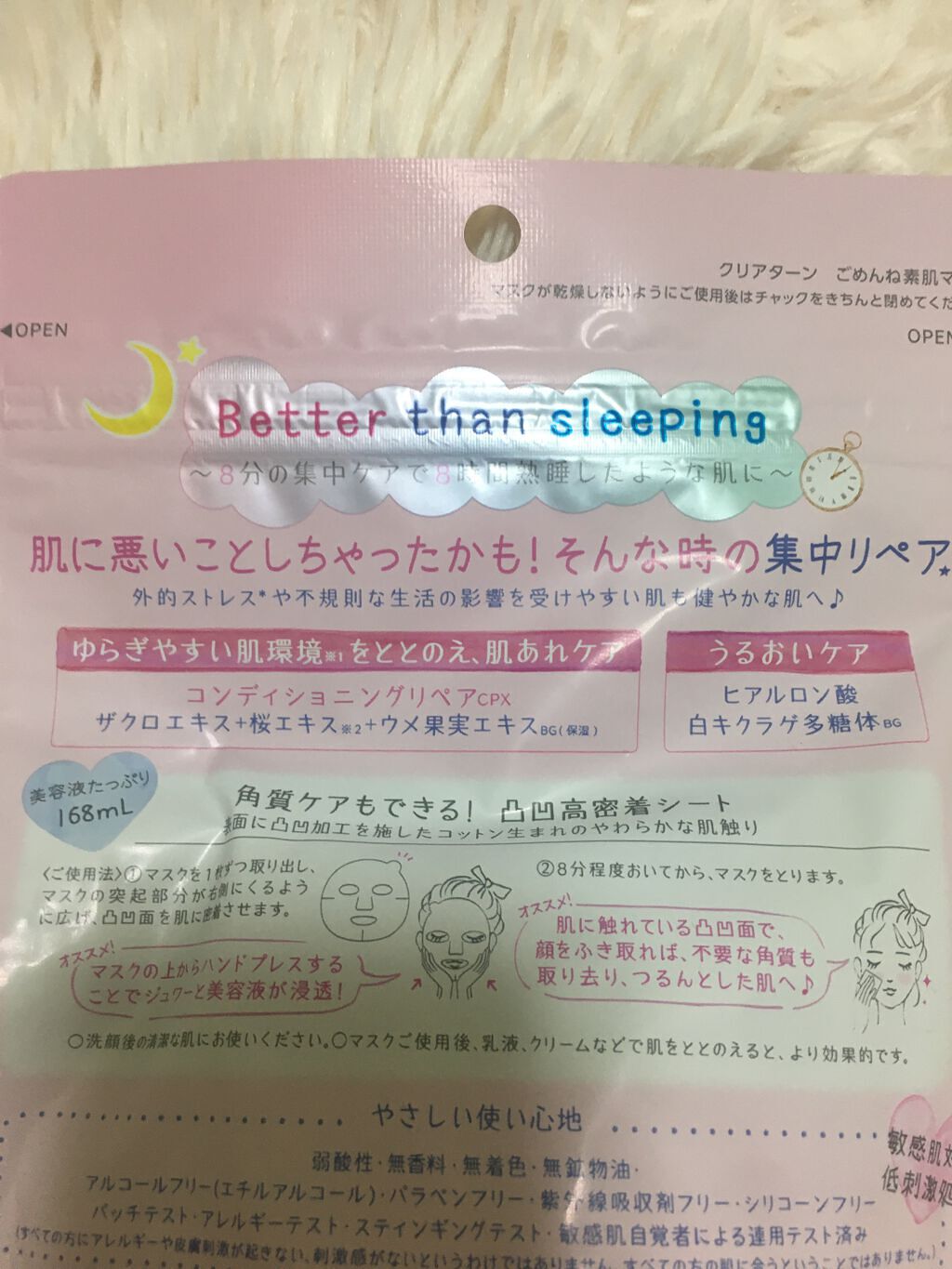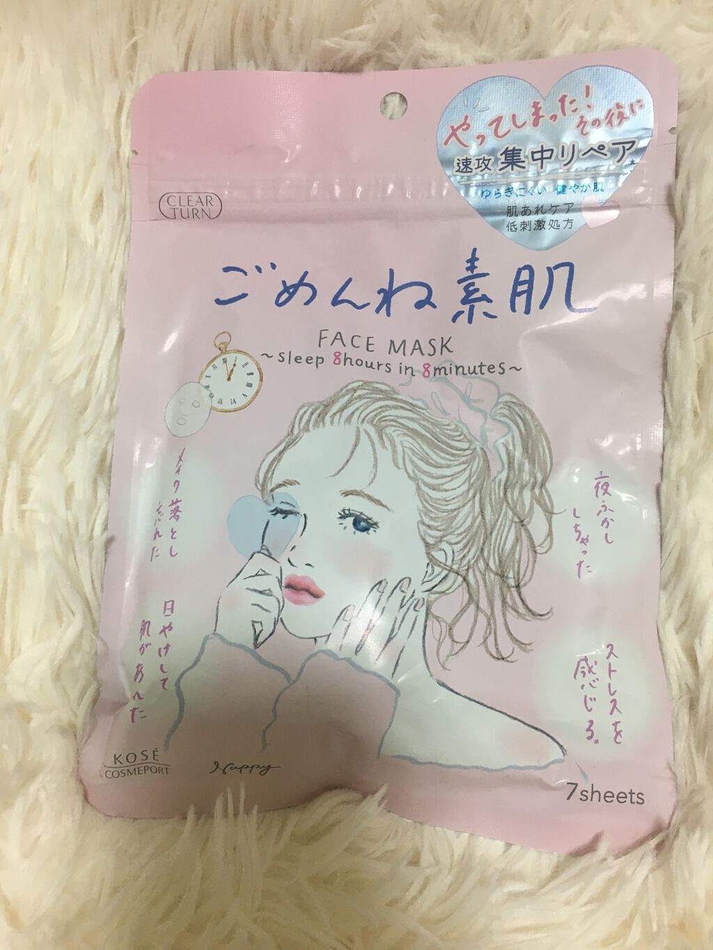 - 【クリアターン ごめんね素肌マスク】 負担をかけて、あれてしまった肌の素肌環境※1をととのえる“速攻集中リペア※2マスク”です。 ① あれがちな肌を素早くコンディションケア! ザクロエキス、桜エキス※3、ウメ果実エキスBG配合し、ゆらぎやすい肌環境をととのえ、肌あれをケアします。また、うるおいケア成分として、ヒアルロン酸、白キクラゲ多糖体BGを配合。外的ストレス※4や不規則な生活の影響を受けやすい肌も健やかでゆらぎにくい肌へみちびきます。 ②敏感肌も使える、弱酸性・低刺激処方 無香料・無着色・無鉱物油・アルコールフリー(エチルアルコール)・パラベンフリー・紫外線吸収剤フリー・シリコーンフリー・パッチテスト済み・アレルギーテスト済み・スティンギングテスト済み・敏感肌自覚者による連用テスト済み(すべての方にアレルギーや皮膚刺激が起きない、刺激感がないというわけではありません。すべての方の肌に合うということではありません。) ③角質ケアもできる!凸凹高密着シート コットン生まれのやわらかな肌触りのベンリーゼを使用。 表面に凸凹のエンボス加工を施しているため、密着性が高く、はがしたマスクでやさしく顔をふきとることで角質ケアもできます。 ※1 うるおい環境のこと ※2 うるおいお手入れのこと ※3 ソメイヨシノ葉エキス、ウメ果実エキスBGはウメ果実エキス・BG(保湿) ※4 乾燥による刺激のこと