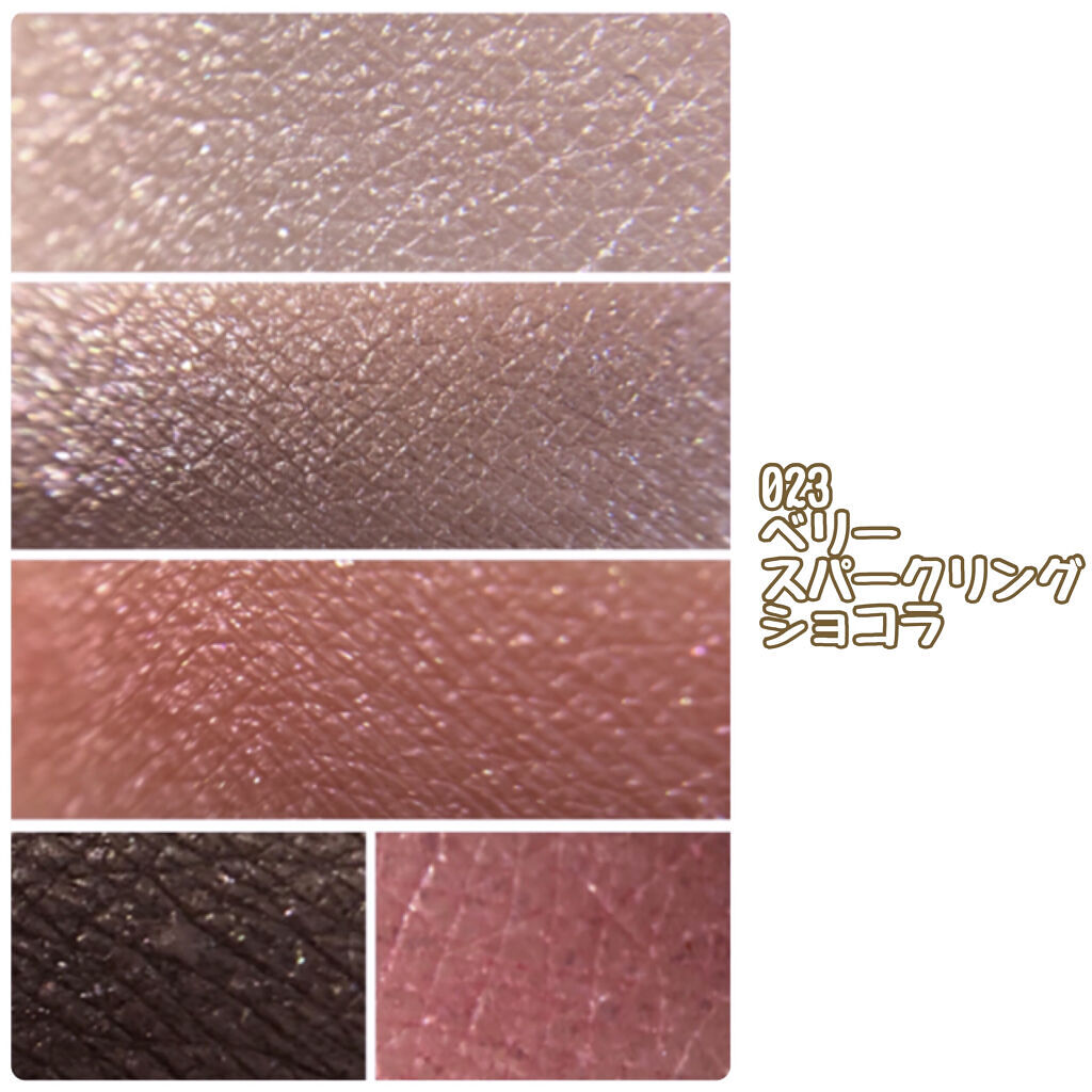 似てるようで結構違うピンク系アイシャドウ 111 サングリアショコラ 鮮やかなピンク&オレンジ 全体的に発色濃いめでクリアな色味 華やか 右下のピンクがとにかくかわいい 023 ベリースパークリングショコラ 全体的に淡い色 私の腕だと2段目のピンクはコーラルっぽく発色 下2段のグレー、ブラウンとピンクを使ってメイクしてます 106 ラズベリーボンボンショコラ メリハリのある組み合わせ 3段目のピンクが絶妙 右下のグレージュはあんまり色つかず、ラメをのせる感じ