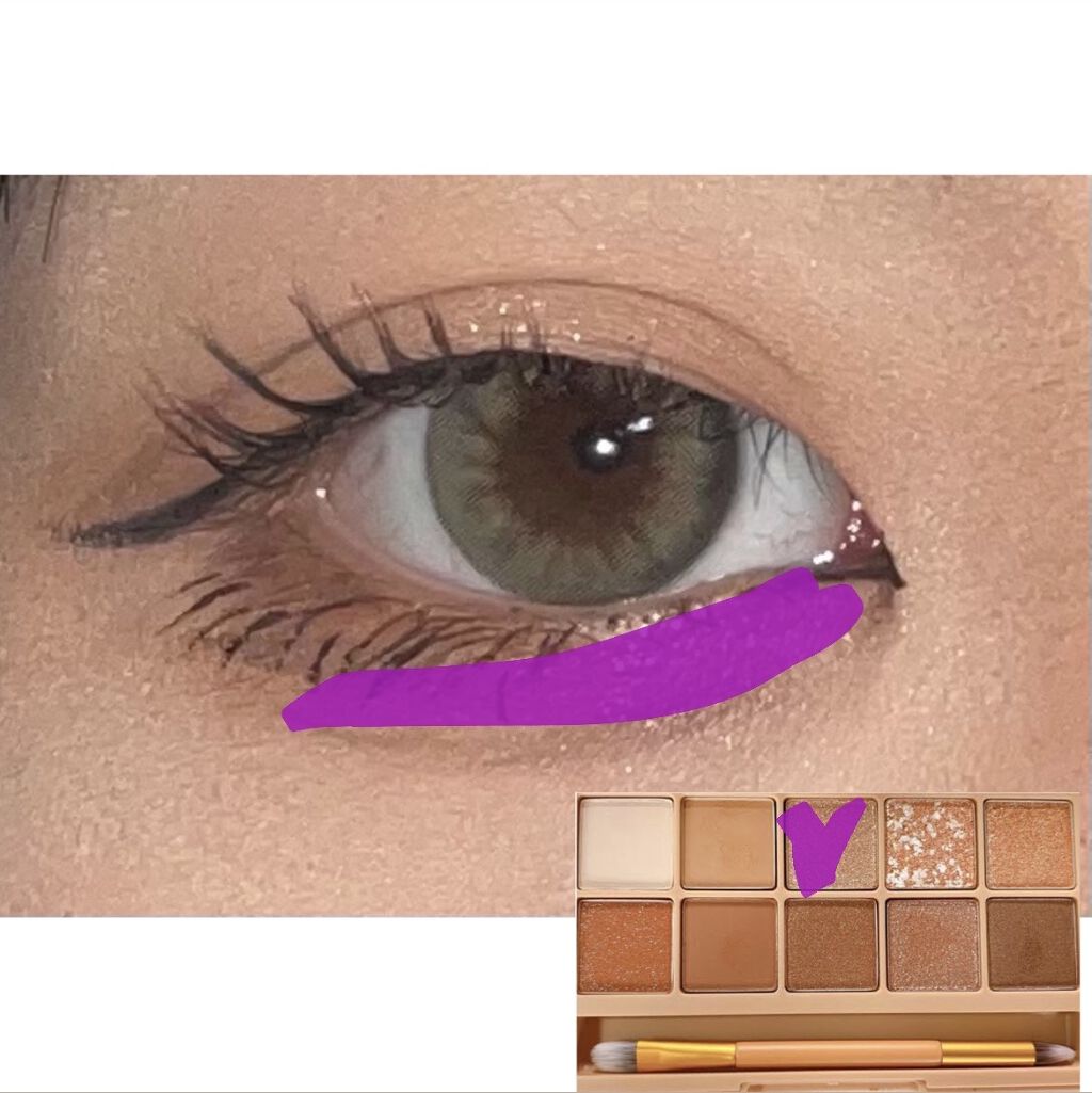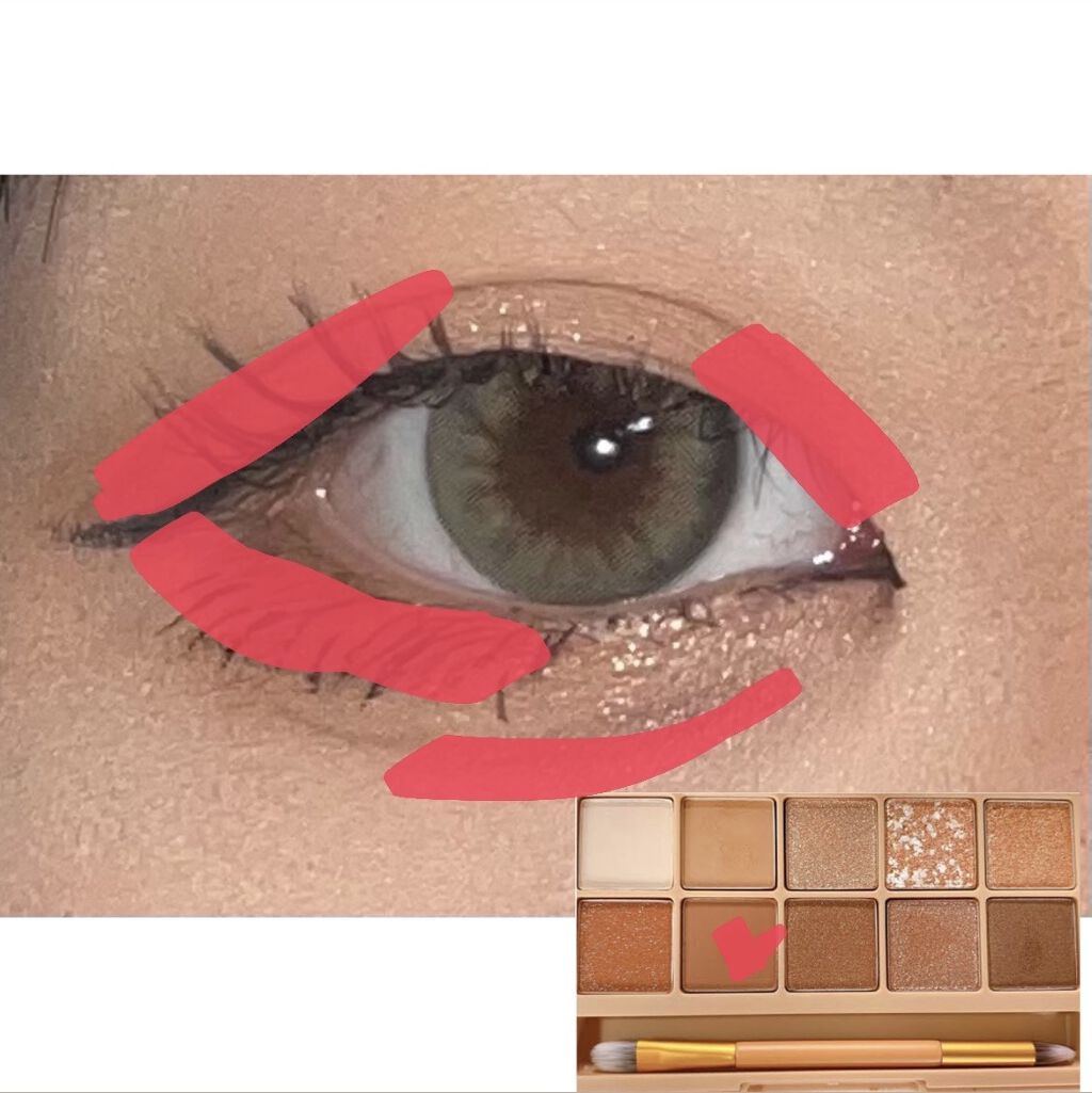 アイシャドウはCLIOのpro eye palette 02番 Brown Chouxを使ってます❕ ♡左上のマットの白色をアイホール全体につけます ♡その隣の黄色めの茶色をまたアイホール全体につけます ♡二重幅にマットの濃いめ茶色をつけます ♡下の段の真ん中の色を下の三角ゾーンと上まぶたの目尻から3分の1にのせます ♡上の段の真ん中を涙袋に乗せます! ♡二重線の延長を書きます ♡涙袋の影を描きます ♡下まぶたの黒目の真ん中から目尻にかけて3角ゾーンを開けた感じで線を引きます! ♡全体に引くのではなく、目尻や真ん中ぐらいからS字になるように細く引きます! ♡ダブルライナーで三角ゾーンを開けて引いた線を使ってしたまつ毛を描きます ♡切開を軽く書いておしまい!!