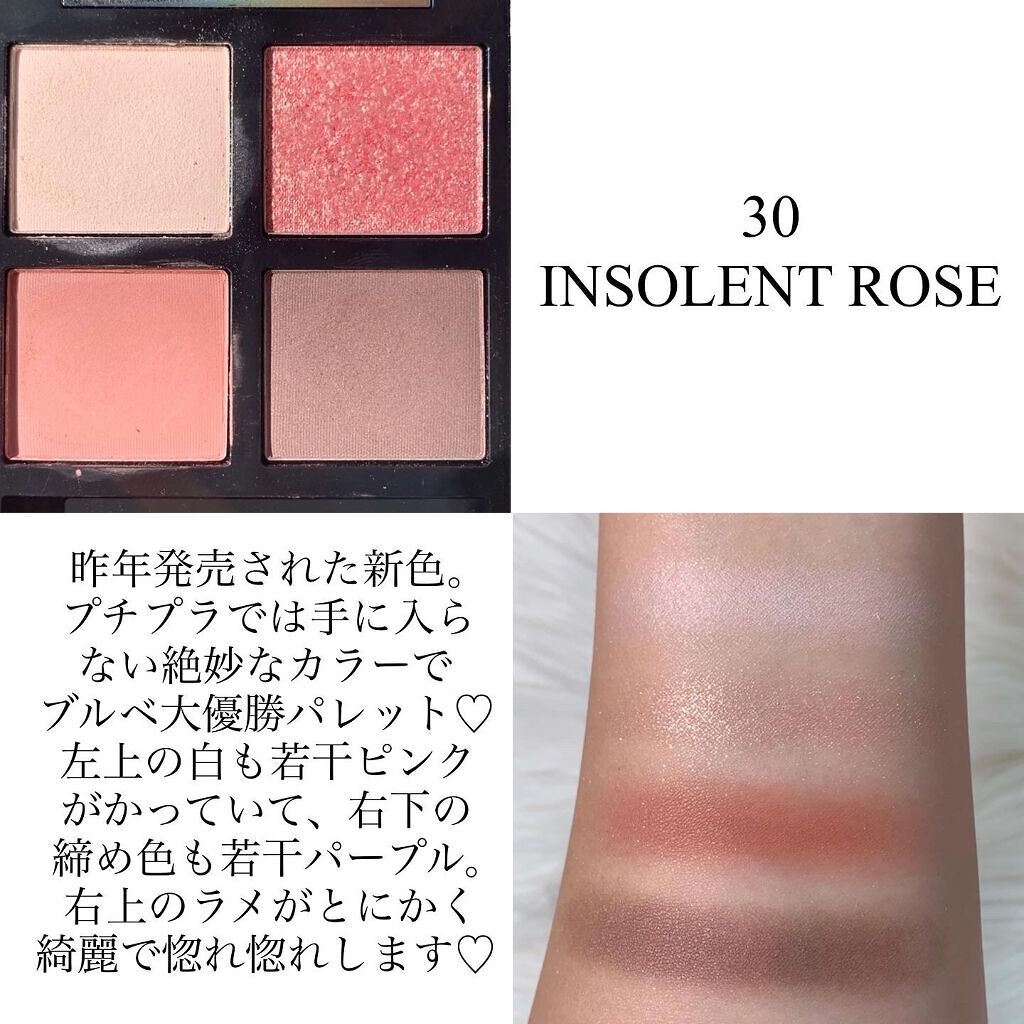 私のデビューカラー。とにかく使い易くてつや感が美しい。迷ったらこれ♡ 右上のピンクに、左下のグレージュを重ねると今までにない透明感のある仕上がりに♡ 左下の赤みブラウンが大好き!一見苦手そうな右上の赤も、キワに入れると普段と違ったメイクが楽しめます♡ 全てが絶妙なカラー。プチプラにはない色味でピンクなのに大人っぽい仕上がりに♡ 去年のクリスマス限定品。息を飲む可愛さで、ブルベ大優勝のパレット♡ 美しいラメ感が楽しめるのは、30番インソレントローズで、残りはつや感が楽しめるパレットになっています😌 "諭吉アイシャドウ"との呼び名もありお値段は高いですが、プチプラにはないクオリティーなので、買う価値あると思います💕