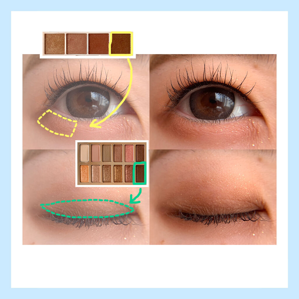 EGLIPSのリトルサンシャインはオレンジパレット界の王さまだと思っています👑 エクセルのピーチメルバは細かいラメがぎっしりで薄づきなので、ベースのすぐ後に全体に塗ってあげると一気に目がオレンジを受け入れられます🧡 最後にのせたBR416はゴールドとレッドのパールがすごく綺麗なので、ピーチメルバとの相性が抜群!