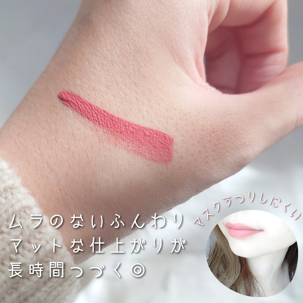 - マットな発色で色もちつづく、 ふんわりルージュ。 point. マスクにつきにくく、色もちつづく マットなのに負担感が少なく、乾きにくい つけ心地ふんわり””シフォンマット”な質感