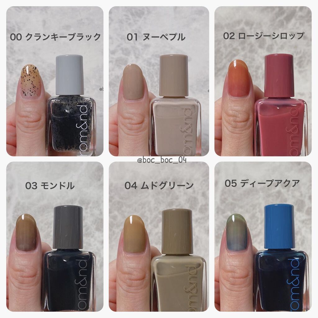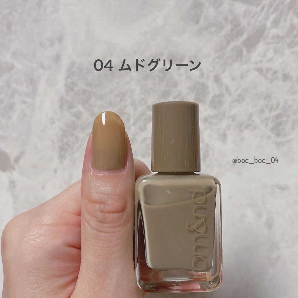 - <00 CRUNKY BLACK(クランキーブラック)> 酢酸ブチル、ニトロセルロース、酢酸エチル、ジ安息香酸DPG、イソプロパノール、アクリレーツコポリマー、ジメチルシリル化シリカ、PET、カンフル、オクトクリレン、ポリウレタン-11、カーボンブラック、Al <01 NU-PEBBLE(ヌーペブル)> 酢酸ブチル、酢酸エチル、ニトロセルロース、イソプロパノール、クエン酸アセチルトリブチル、アクリレーツコポリマー、(アジピン酸/ネオペンチルグリコール/無水トリメリト酸)コポリマー、ジ安息香酸DPG、エタノール、ステアラルコニウムベントナイト、(スチレン/アクリレーツ)コポリマー、酸化チタン、オクトクリレン、ブタノール、カンフル、メトキシケイヒ酸エチルヘキシル、ジ安息香酸トリメチルペンタンジイル、酸化鉄、黄4、ポリビニルブチラール、エチルセルロース、カーボンブラック、赤201、ステアラルコニウムヘクトライト <03 MONGDOL(モンドル)> 酢酸ブチル、ニトロセルロース、酢酸エチル、イソプロパノール、アクリレーツコポリマー、ジ安息香酸DPG、エタノール、カンフル、ジメチルシリル化シリカ、オクトクリレン、メトキシケイヒ酸エチルヘキシル、エチルセルロース、カーボンブラック、クエン酸アセチルトリブチル <04 MUD GREEN(マッドグリーン)> 酢酸ブチル、酢酸エチル、ニトロセルロース、イソプロパノール、クエン酸アセチルトリブチル、アクリレーツコポリマー、(アジピン酸/ネオペンチルグリコール/無水トリメリト酸)コポリマー、ジ安息香酸DPG、エタノール、ステアラルコニウムベントナイト、(スチレン/アクリレーツ)コポリマー、オクトクリレン、ブタノール、カンフル、酸化チタン、メトキシケイヒ酸エチルヘキシル、黄4、ジ安息香酸トリメチルペンタンジイル、ポリビニルブチラール、酸化鉄、エチルセルロース、カーボンブラック、コンジョウ、ステアラルコニウムヘクトライト <05 DEEP AQUA(ディープアクア)> 酢酸ブチル、ニトロセルロース、酢酸エチル、イソプロパノール、アクリレーツコポリマー、ジ安息香酸DPG、エタノール、カンフル、ジメチルシリル化シリカ、オクトクリレン、メトキシケイヒ酸エチルヘキシル、(スチレン/アクリレーツ)コポリマー、クエン酸アセチルトリブチル、コンジョウ、エチルセルロース、カーボンブラック <06 OK(オク)> 酢酸ブチル、酢酸エチル、ニトロセルロース、イソプロパノール、クエン酸アセチルトリブチル、アクリレーツコポリマー、(アジピン酸/ネオペンチルグリコール/無水トリメリト酸)コポリマー、ジ安息香酸DPG、エタノール、ステアラルコニウムベントナイト、(スチレン/アクリレーツ)コポリマー、オクトクリレン、ブタノール、カンフル、酸化チタン、メトキシケイヒ酸エチルヘキシル、ジ安息香酸トリメチルペンタンジイル、ポリビニルブチラール、コンジョウ、エチルセルロース、黄4、カーボンブラック <08 PURPLE MOOD(パープルムード)> 酢酸ブチル、ニトロセルロース、酢酸エチル、イソプロパノール、アクリレーツコポリマー、ジ安息香酸DPG、エタノール、カンフル、ジメチルシリル化シリカ、オクトクリレン、グンジョウ、クエン酸アセチルトリブチル、(スチレン/アクリレーツ)コポリマー、メトキシケイヒ酸エチルヘキシル、赤201、エチルセルロース、ステアラルコニウムヘクトライト、カーボンブラック <02 ROSY SYRUP(ロージーシロップ)> 酢酸ブチル、ニトロセルロース、酢酸エチル、イソプロパノール、アクリレーツコポリマー、ジ安息香酸DPG、エタノール、カンフル、ジメチルシリル化シリカ、オクトクリレン、酸化チタン、メトキシケイヒ酸エチルヘキシル、(スチレン/アクリレーツ)コポリマー、クエン酸アセチルトリブチル、酸化鉄、赤201、エチルセルロース、水酸化Al、カーボンブラック、メチコン、ステアラルコニウムヘクトライト <07 MAUVE SAND(モーブサンド)> 酢酸ブチル、酢酸エチル、ニトロセルロース、イソプロパノール、クエン酸アセチルトリブチル、アクリレーツコポリマー、(アジピン酸/ネオペンチルグリコール/無水トリメリト酸)コポリマー、ジ安息香酸DPG、エタノール、ステアラルコニウムベントナイト、(スチレン/アクリレーツ)コポリマー、オクトクリレン、ブタノール、カンフル、酸化チタン、メトキシケイヒ酸エチルヘキシル、ジ安息香酸トリメチルペンタンジイル、酸化鉄、ポリビニルブチラール、エチルセルロース、カーボンブラック、赤201、ステアラルコニウムヘクトライト
