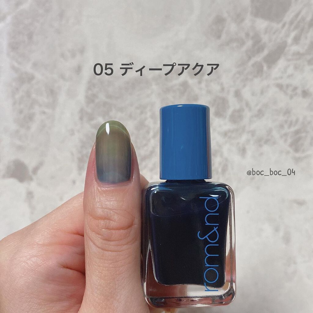 - 指先に玉石のような、ならかな光沢をとどめる。塗った瞬間から綺麗なツヤと光沢を維持し、重ねて塗っても透き通ったカラー感を鮮やかにとどめる、素早い乾燥力のナチュラルカラーネイル。「ロムアンド」の次世代型ネイルです。