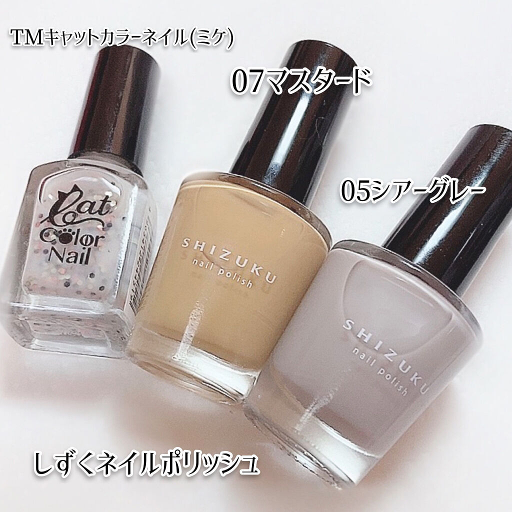 しずくネイルポリッシュのコンセプトは 【プチプラでも塗りやすいマニキュア】 しずくネイルポリッシュは液が逸品✨ ムラなく綺麗に仕上がるので セルフネイルが苦手な方におすすめしたい シリーズです🙌 04モーヴトープだけ 微細な偏光パールが入っていて ニュアンスのある1本です 05シアーグレー 06シアーホワイト は旬のシアー系でグラデやニュアンスにも✨ 07マスタード 1番攻めたカラーだそうで シャレ感のある1本です