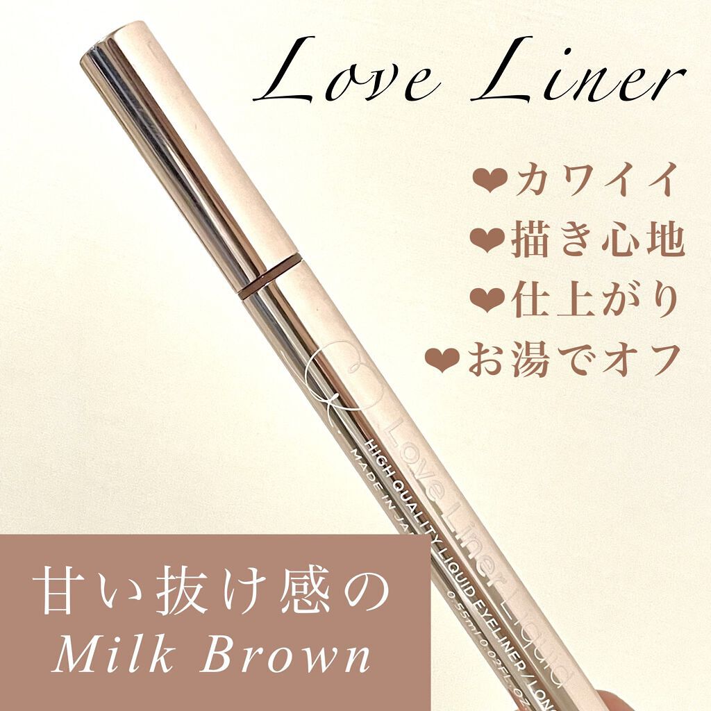 色がオシャレ ヌーディーな目元作りにおすすめのカラー 「ミルクブラウン」 この甘いミルクブラウンが いい感じに肌に馴染んでくれて ふんわり抜け感がでるんです! 描きやすーい 同じ力加減で描いているのに 太くなったり細くなったり 線が上手く引けないことありませんか? わたしもよく失敗するから リキッドでライン引くときは 必ず綿棒を待機させてました…汗 このラブライナーは、 肌の繊細な凸凹にフィットするように計算しつくされた筆先なんです! 高機能 ①美容成分配合で 目元のケアもできて ②ウォータープルーフで 皮脂や汗でもにじみにくい ③なのにお湯でオフできる プチプラなのにスペック高すぎ!!!