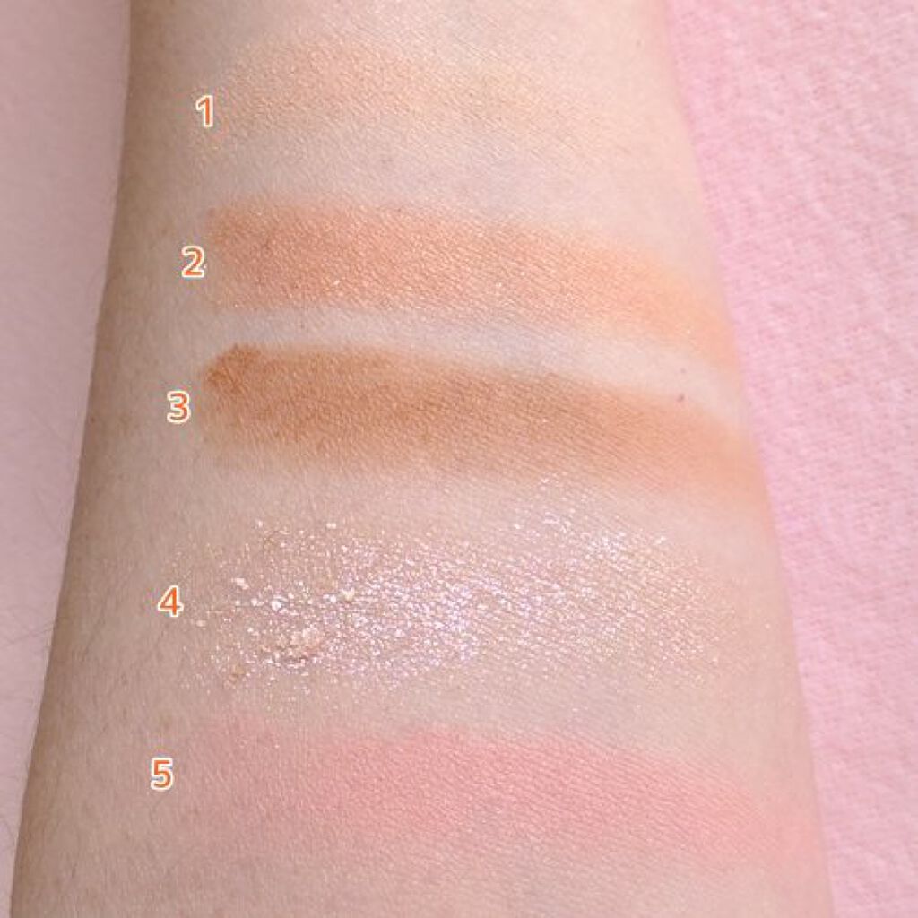 - <001 スウィートピンク> タルク、マイカ、グンジョウ、トリ(カプリル酸/カプリン酸)グリセリル、シリカ、窒化ホウ素、ステアロイルオキシステアリン酸オクチルドデシル、メチルプロパンジオール、ミリスチン酸Mg、マンガンバイオレット、ジメチコン、ミネラルオイル、プロパンジオール、赤酸化鉄、ヒドロキシプロピルビスパルミタミドMEA、ステアリン酸ジメチコノール、黄酸化鉄、ステアリン酸Mg、黒酸化鉄、トリエトキシカプリリルシラン、酸化チタン、メチコン、水 <002 ハローピーチ> マイカ、タルク、ホウケイ酸(Ca/Al)、酸化チタン、シリカ、ジエチルヘキサン酸ネオペンチルグリコール、フェニルトリメチコン、赤酸化鉄、グンジョウ、リンゴ酸ジイソステアリル、ヘキサ(ヒドロキシステアリン酸/ステアリン酸/ロジン酸)ジペンタエリスリチル、ネオペンタン酸イソステアリル、ステアロイルオキシステアリン酸オクチルドデシル、ミリスチン酸Mg、マンガンバイオレット、メチルプロパンジオール、ジメチコン、マカデミア種子油、ポリブテン、ステアリン酸Mg、プロパンジオール、トリエトキシカプリリルシラン、酸化スズ、メチコン、水 <003 ベイクド ジンジャー> タルク、マイカ、グンジョウ、シリカ、マンガンバイオレット、酸化チタン、トリ(カプリル酸/カプリン酸)グリセリル、赤酸化鉄、窒化ホウ素、黄酸化鉄、黒酸化鉄、ミリスチン酸Mg、ミネラルオイル、ステアロイルオキシステアリン酸オクチルドデシル、メチルプロパンジオール、ジメチコン、プロパンジオール、黄色4号、ヒドロキシプロピルビスパルミタミドMEA、ステアリン酸ジメチコノール、ステアリン酸Mg、トリエトキシカプリリルシラン、水 <004 グラムローズ> ホウケイ酸(Ca/Al)、タルク、ホウケイ酸(Ca/チタン)、マイカ、ジエチルヘキサン酸ネオペンチルグリコール、酸化チタン、フェニルトリメチコン、シリカ、ミリスチン酸Mg、リンゴ酸ジイソステアリル、ヘキサ(ヒドロキシステアリン酸/ステアリン酸/ロジン酸)ジペンタエリスリチル、ネオペンタン酸イソステアリル、ステアロイルオキシステアリン酸オクチルドデシル、グンジョウ、ステアリン酸Mg、メタクリル酸メチルクロスポリマー、メチルプロパンジオール、ポリブテン、プロパンジオール、酸化スズ、ジメチコン、ラウロイルリシン、マンガンバイオレット、赤酸化鉄、トリエトキシカプリリルシラン、黄酸化鉄、メチコン、水
