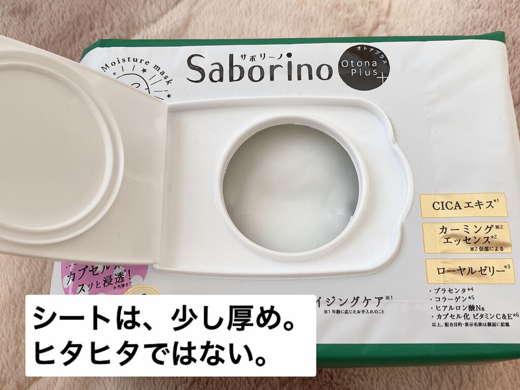 - 【LOFT限定】CICA*1配合のサボリーノオトナプラス登場。 ●CICA*1エキス+カーミング*2エキス*3配合 オトナ肌をいたわるカプセル化成分を配合し、 瞬時に弾けてスッと肌の角層まで浸透します。 ●乾燥する肌に、リッチな保湿成分たっぷり ローヤルゼリーエキスやプラセンタエキス、コラーゲン*4など とろりと濃密な潤いでお肌を保湿します。 ●60秒で夜のスキンケアパーフェクト お風呂あがりに60秒貼るだけで、 化粧水+乳液+美容液+クリーム+パックが完了! 全国のロフトにて数量限定発売。
