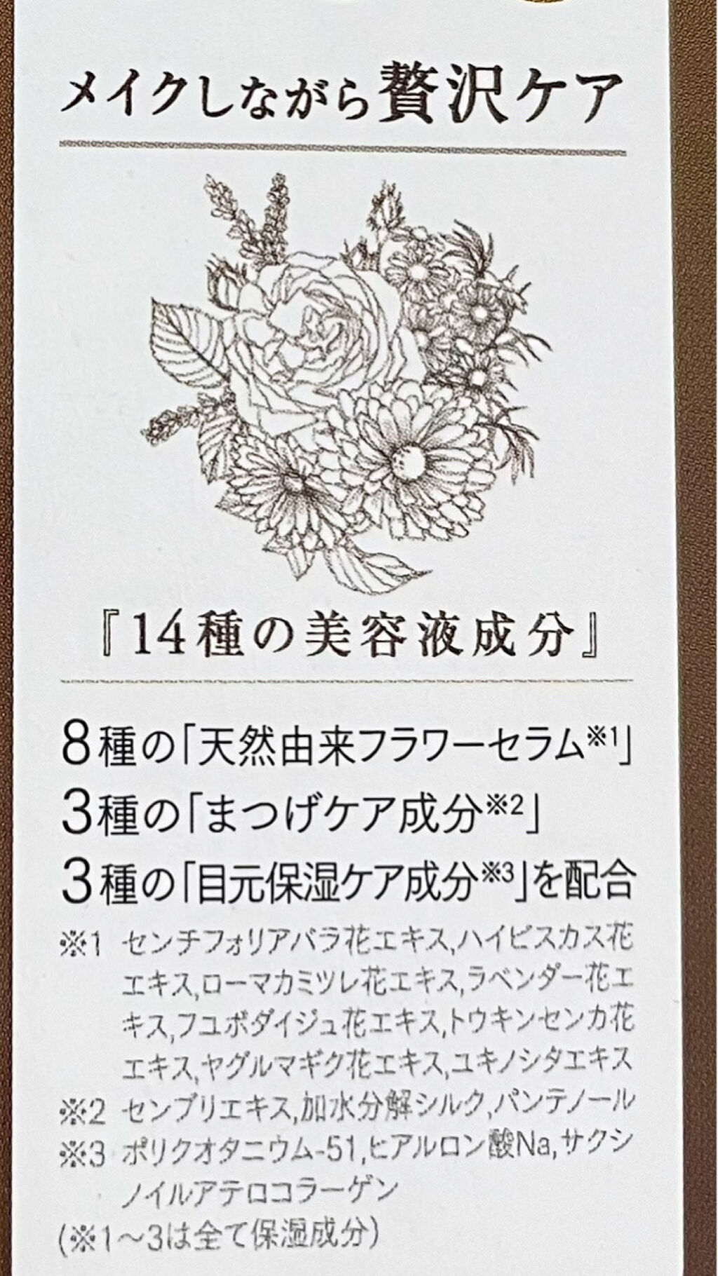 - <06 ルージュバーガンディ> 水、(アクリル酸エチルヘキシル/メタクリル酸メチル)コポリマー、BG、アクリレーツコポリマー、(アクリレーツ/メチルスチレン/スチレン)コポリマーアンモニウム、ヒアルロン酸Na、サクシノイルアテロコラーゲン、ポリクオタニウム-51、パンテノール、加水分解シルク、センブリエキス、センチフォリアバラ花エキス、ハイビスカス花エキス、ローマカミツレ花エキス、ラベンダー花エキス、フユボダイジュ花エキス、トウキンセンカ花エキス、ヤグルマギク花エキス、ユキノシタエキス、カミツレ花エキス、セイヨウオトギリソウ花/葉/茎エキス、1,2-ヘキサンジオール、ペンチレングリコール、ポリアスパラギン酸Na、水酸化K、ベヘネス-30、カプリリルグリコール、エチルヘキシルグリセリン、EDTA-2Na、水酸化Na、リン酸2Na、リン酸K、フェノキシエタノール、エタノール、メチルパラベン、赤226、酸化チタン、カーボンブラック <08 ヘーゼルカーキ> 水、(スチレン/アクリレーツ)コポリマーアンモニウム、BG、炭、1,2-ヘキサンジオール、ヒアルロン酸Na、サクシノイルアテロコラーゲン、ポリクオタニウム-51、パンテノール、加水分解シルク、センブリエキス、センチフォリアバラ花エキス、ハイビスカス花エキス、ローマカミツレ花エキス、ラベンダー花エキス、フユボダイジュ花エキス、トウキンセンカ花エキス、ヤグルマギク花エキス、ユキノシタエキス、カミツレ花エキス、セイヨウオトギリソウ花/葉/茎エキス、ユチャ種子油、グリセリン、カプリリルグリコール、ペンチレングリコール、エチルヘキシルグリセリン、トコフェロール、アクリレーツコポリマーアンモニウム、ポリアスパラギン酸Na、べへネス-30、EDTA-2Na、フィチン酸、水酸化K、リン酸2Na、リン酸K、サーファクチンNa、フェノキシエタノール、エタノール、メチルパラベン、酸化鉄 <09 トワイライトパープル> 水、(スチレン/アクリレーツ)コポリマーアンモニウム、BG、アクリレーツコポリマー、1,2-ヘキサンジオール、ヒアルロン酸Na、サクシノイルアテロコラーゲン、ポリクオタニウム-51、パンテノール、加水分解シルク、センブリエキス、センチフォリアバラ花エキス、ハイビスカス花エキス、ローマカミツレ花エキス、ラベンダー花エキス、フユボダイジュ花エキス、トウキンセンカ花エキス、ヤグルマギク花エキス、ユキノシタエキス、カミツレ花エキス、セイヨウオトギリソウ花/葉/茎エキス、カプリリルグリコール、ペンチレングリコール、エチルヘキシルグリセリン、ポリアスパラギン酸Na、ベヘネス-30、EDTA-2Na、水酸化K、水酸化Na、リン酸2Na、リン酸K、ベントナイト、フェノキシエタノール、エタノール、メチルパラベン、酸化チタン、グンジョウ、赤226、カーボンブラック <10 ピンクヘイズブラウン> 水、アクリレーツコポリマー、BG、炭、1,2-ヘキサンジオール、ヒアルロン酸Na、サクシノイルアテロコラーゲン、ポリクオタニウム-51、パンテノール、加水分解シルク、センブリエキス、センチフォリアバラ花エキス、ハイビスカス花エキス、ローマカミツレ花エキス、ラベンダー花エキス、フユボダイジュ花エキス、トウキンセンカ花エキス、ヤグルマギク花エキス、ユキノシタエキス、カミツレ花エキス、セイヨウオトギリソウ花/葉/茎エキス、グリセリン、結晶セルロース、エチルヘキシルグリセリン、カプリリルグリコール、ジラウロイルグルタミン酸リシンNa、デキストリン、ヒドロキシプロピルデンプン、べへネスー25、EDTA-2Na、水酸化K、水酸化Al、リン酸2Na、DPG、キサンタンガム、ペンチレングリコール、リン酸K、ポリアスパラギン酸Na、フェノキシエタノール、エタノール、メチルパラベン、酸化鉄、赤226、酸化チタン