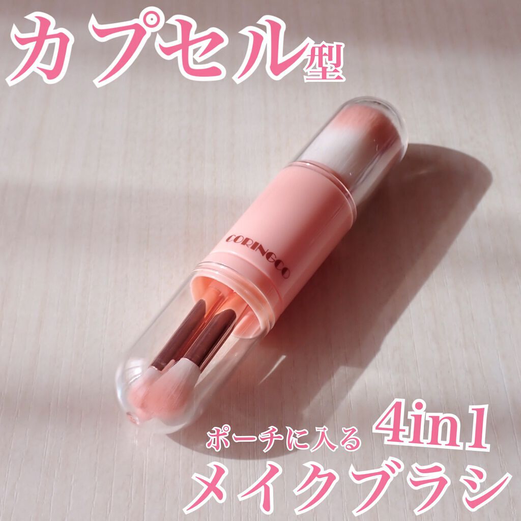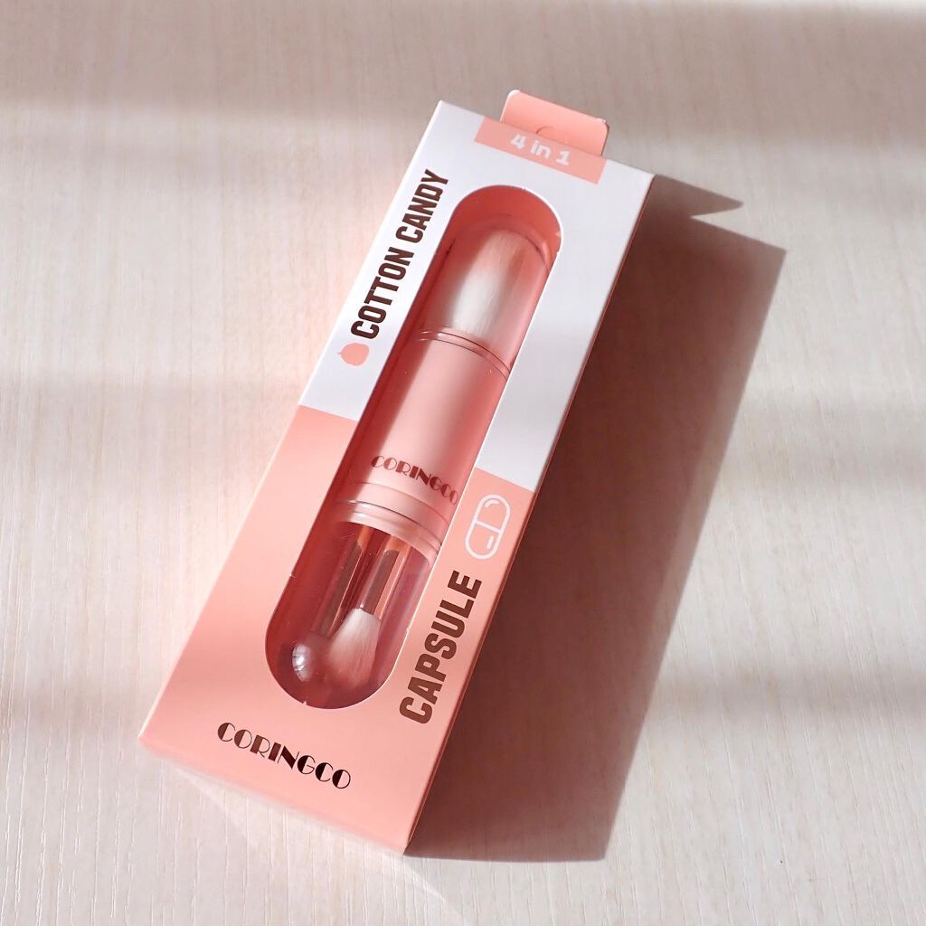 CORINGCOの4in1 コットンキャンディーカプセルブラシです 1本のブラシの両端にブラシがついていて、4in1になっています 毛が柔らかいので、とても塗りやすいです キャップが付いているので、衛生的にも良く、メイクポーチやカバンに入れて、持ち運びがしやすいです ワンコインでドンキで購入することができます