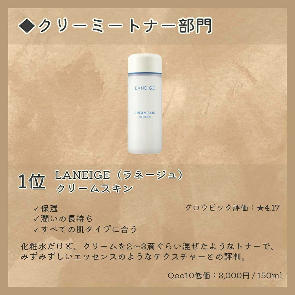 ウォータートナー部門1位: @manyofactory_japan の #ビフィダバイオームアンプルトナー2位: @anua.skincare_jp の #ドクダミ77スージングトナー3位: @la.bodre の #ナッシングバット24Hチョンドゥクトナー クリーミートナー部門1位: @laneige_kr の #クリームスキン2位: @tonymoly.jp_official の #ワンダーセラミドモチトナー3位: @fraijour_official の #クリームフレジュモイスチャータンパク質保湿トナー エッセンストナー部門1位: @bioderma_japon の #イドラビオエッセンスローション2位: @numbuzin_official_jp の #3番うるツヤ発酵トナー3位: @cosrx_jp の #フルフィットプロポリスシナジートナー