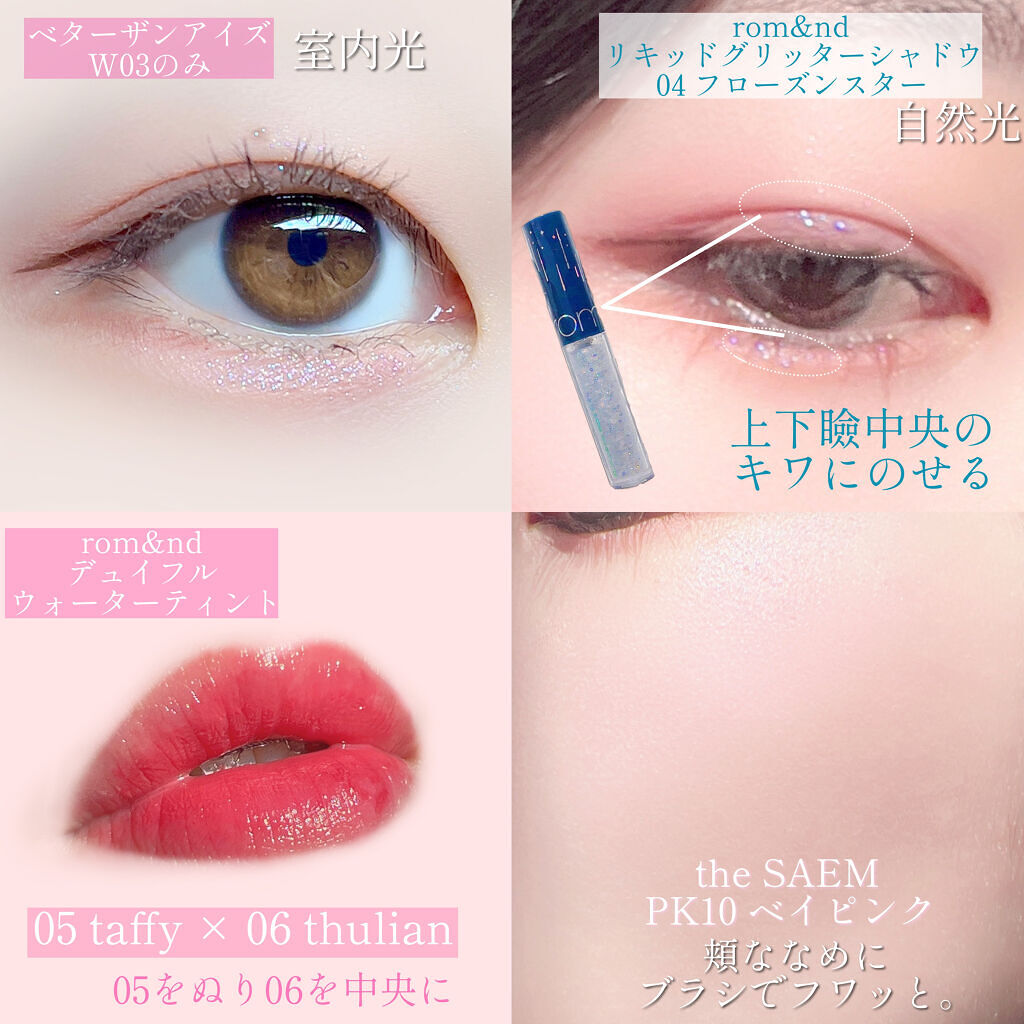 涙袋ぷっくりメイク☁️桜ぴんくざくざくラメがかわちすぎる‥🩷今回使用した商品rom&ndリキッドグリッターシャドウ05 ラビーフレア¥1,100色味はピンク寄りの紫で透明感を出すのにはうってつけの色味!ピンクラベンダーカラーがレア感があり、あ...