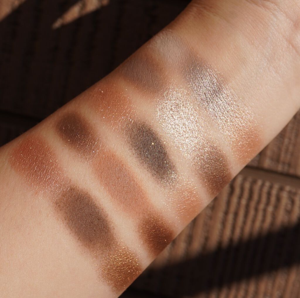 クリーミーなマット仕上げとメタリック仕上げの 5 つの温かみのあるニュートラル シェードが特徴です。 この色合いはもう大好物😋✨️ 見た目以上に高発色なので使い方には注意が必要ですが、カラー的には使いやすいので大好き💓♥️❤️ 「FLESH」と「GOBI」は見た目はそんなに濃く発色しないように見えますが、まぶたにのせるとかなり色味が付くので、この2色だけでも仕上げられるくらい😆