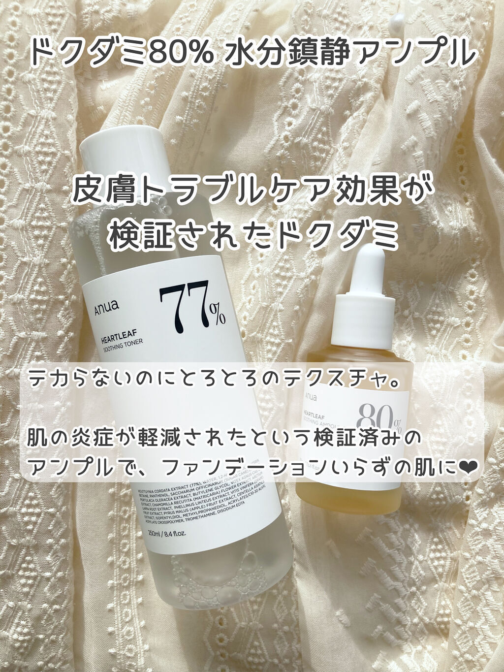 今回紹介するのは、Anuaのドクダミ77% スージングトナーとドクダミ80%スージングアンプルです! さらっとしておりべたつかないので初心者の方でも使いやすいです! これからの時期には保湿力が足りないかも?とは思いますが、乳液の後クリームを塗れば大丈夫かも!