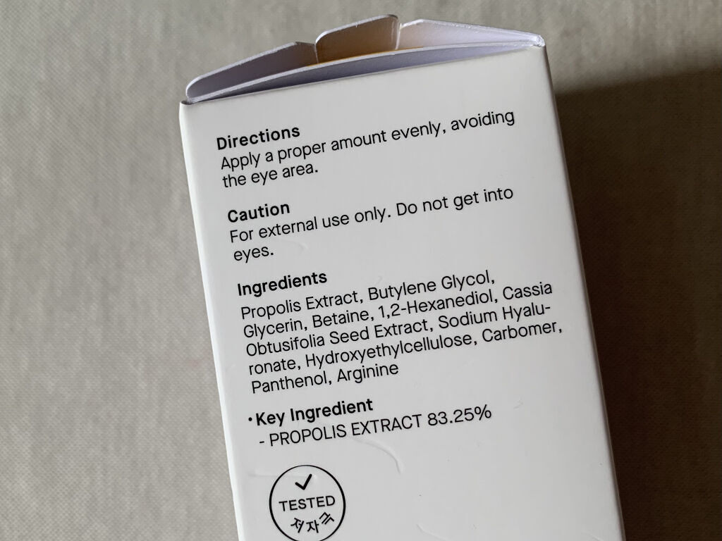 - <30ml> プロポリスエキス、ブチレングリコール、グリセリン、べタイン、1,2-ヘキサンジオール、カッシアオブッシフォリア種子エキス、ヒアルロン酸Na、ヒドロキシエチルセルロース、カルボマー、パンテノール、アルギニン